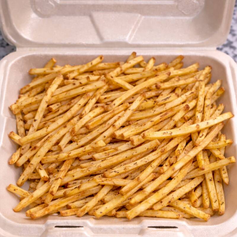 Una gran porción de papas de corte delgado, fritas hasta alcanzar el dorado perfecto: crujientes por fuera y suaves por dentro, sazonadas con sal del Himalaya