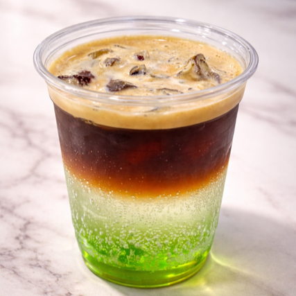 Bebida fria a base de agua tónica con un toque de manzana verde y un espresso de café