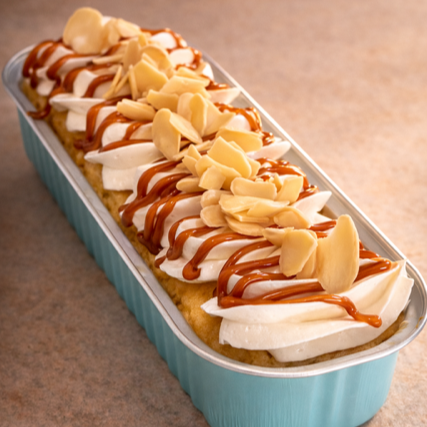 Delicioso pastel tres leches, coronado con dulce de leche y almendra