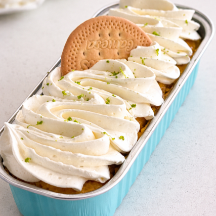 Pastel tres leches coronado con crema y galleta Lotus Biscoff