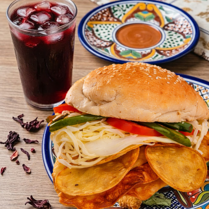 Pan de Cemita tradicional, Milanesa, papas, quesillo, aguacate, rajas o chipotle y Agua de Sabor del Día 1/2 L