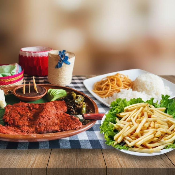 Carne Enchilada, arroz o spaghetti, papas fritas y lechuga.