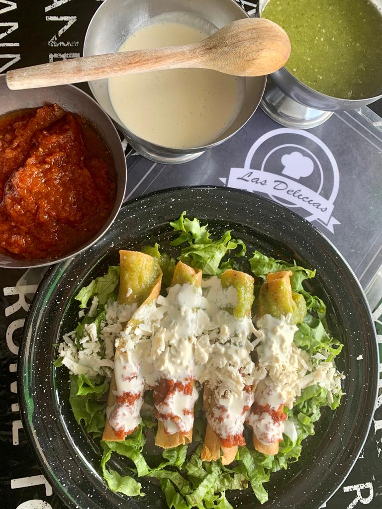 4 piezas de tacos dorados 2 de pollo y 2 de queso sobre cama de lechuga incluyen salsa, crema y queso para que los prepares a tu gusto con 1 agua del dia