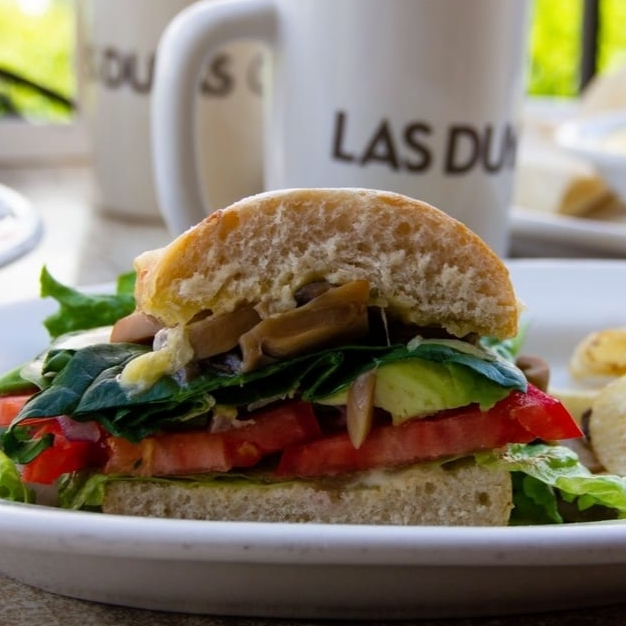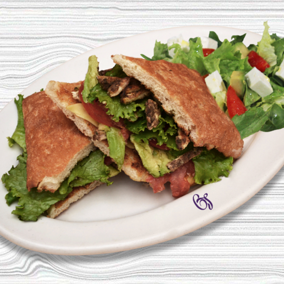 Champiñones y espinacas, pan artesanal con queso, aguacate, jitomate, cebolla, lechuga y aderezo español, acompañado de papas fritas o ensalada.