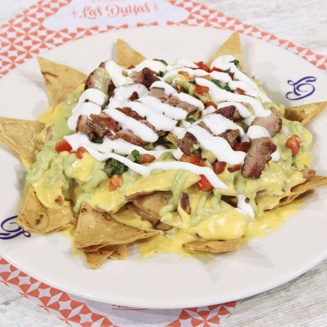 Frijol , salsa de queso , pico de gallo, guacamole y crema