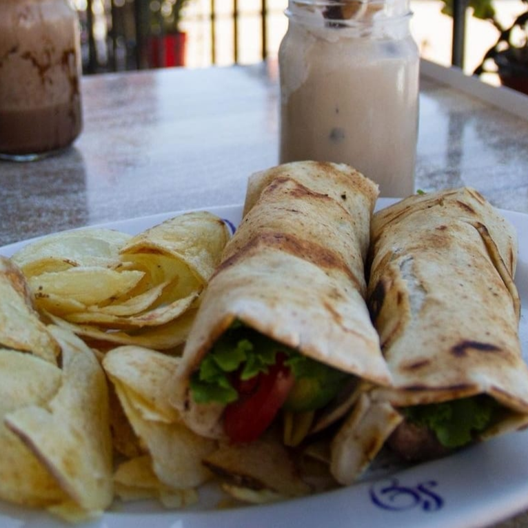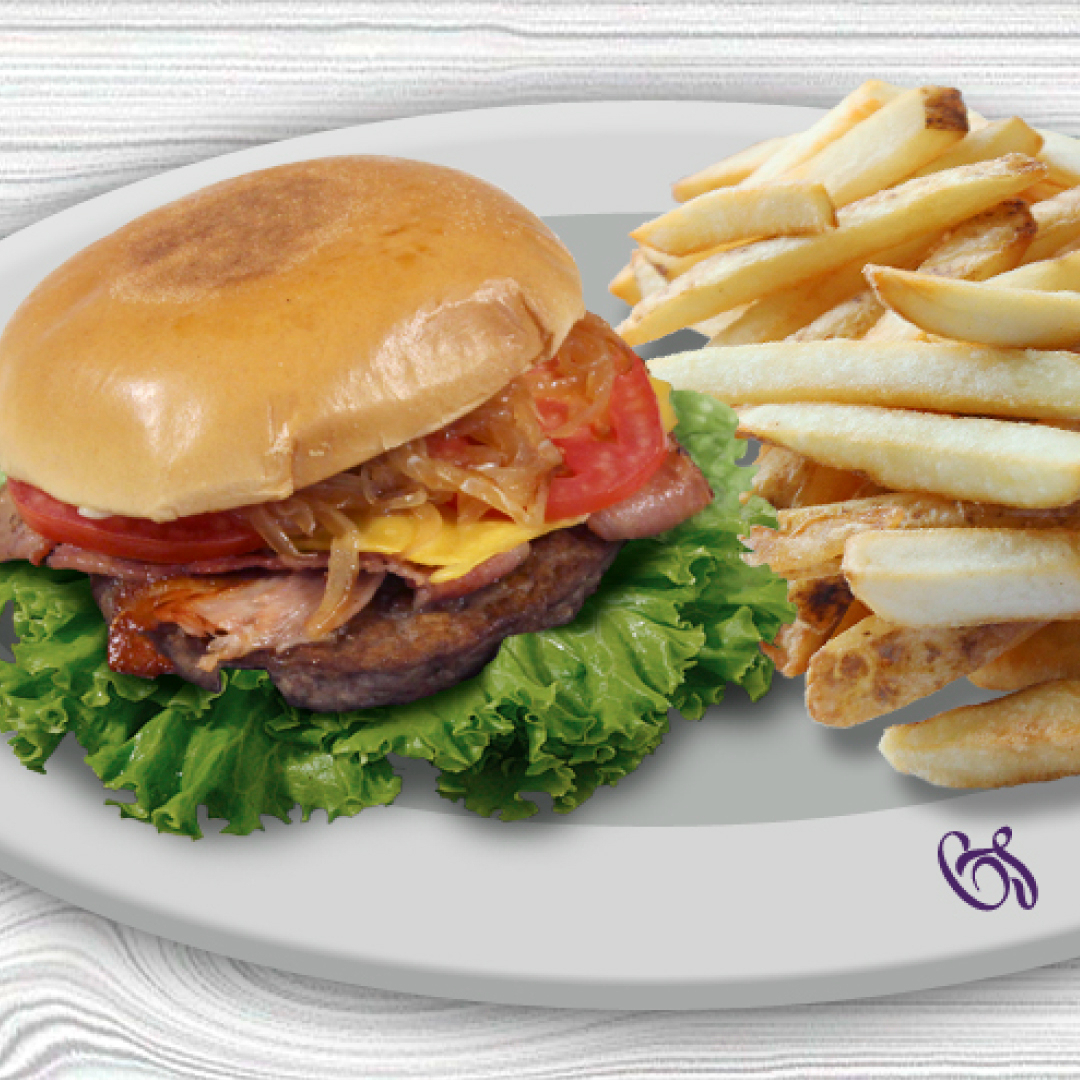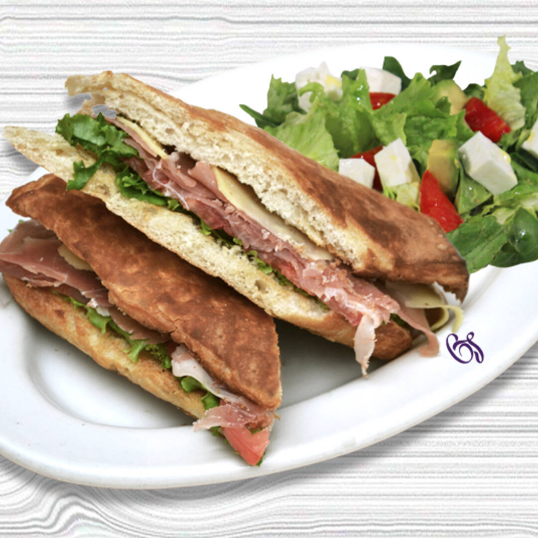 Pan artesanal con queso, aguacate, jitomate, cebolla, lechuga y aderezo español, acompañado de papas fritas o ensalada.