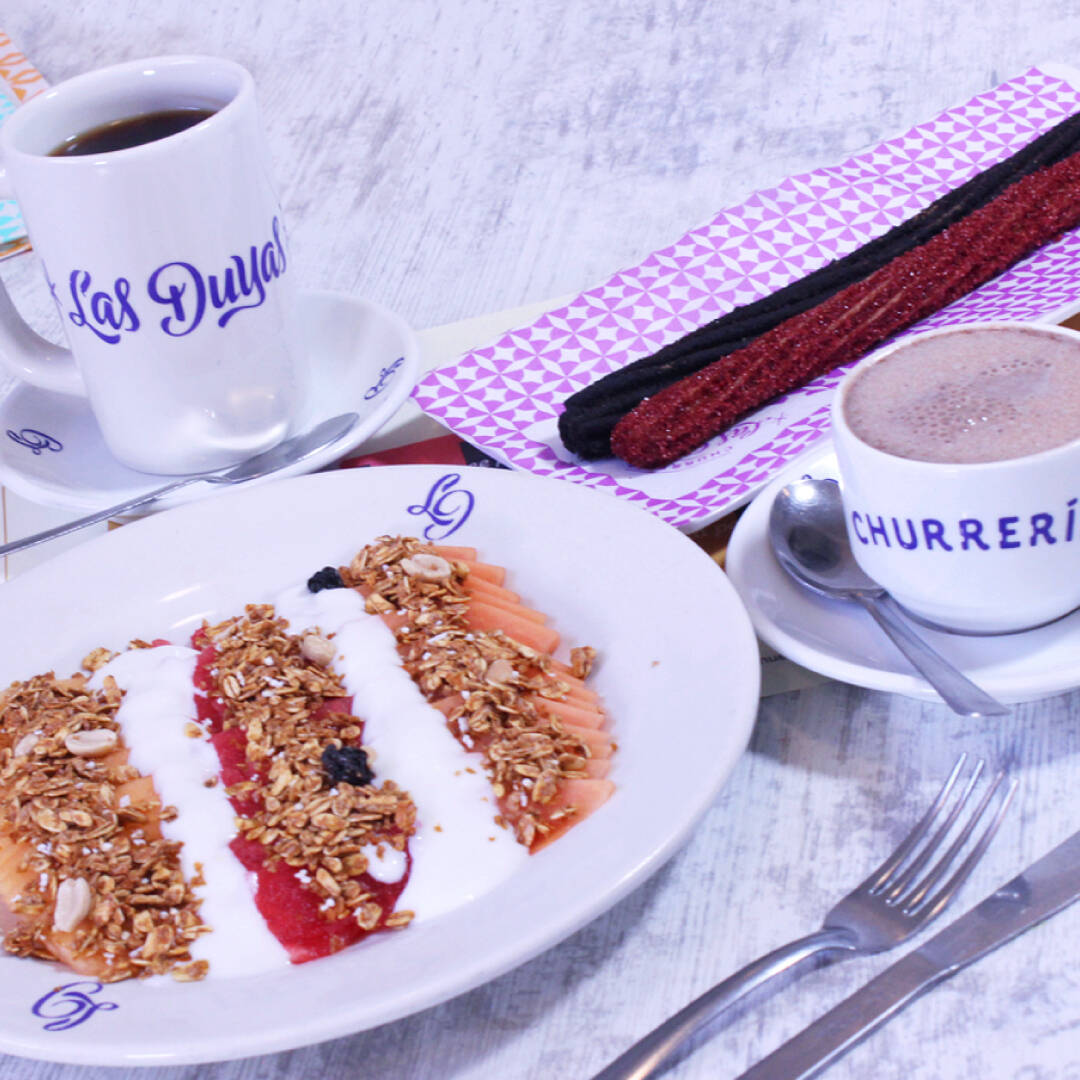 2 Churros sencillos o 1 churrot más café americano y 1 bebida caliente a elegir más jugo o fruta.