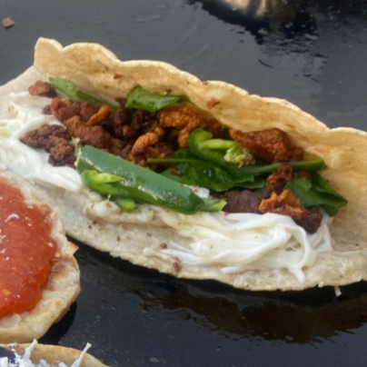 tortila de maiz con quesillo, bistec, longaniza, rajas y epazote