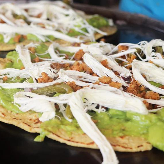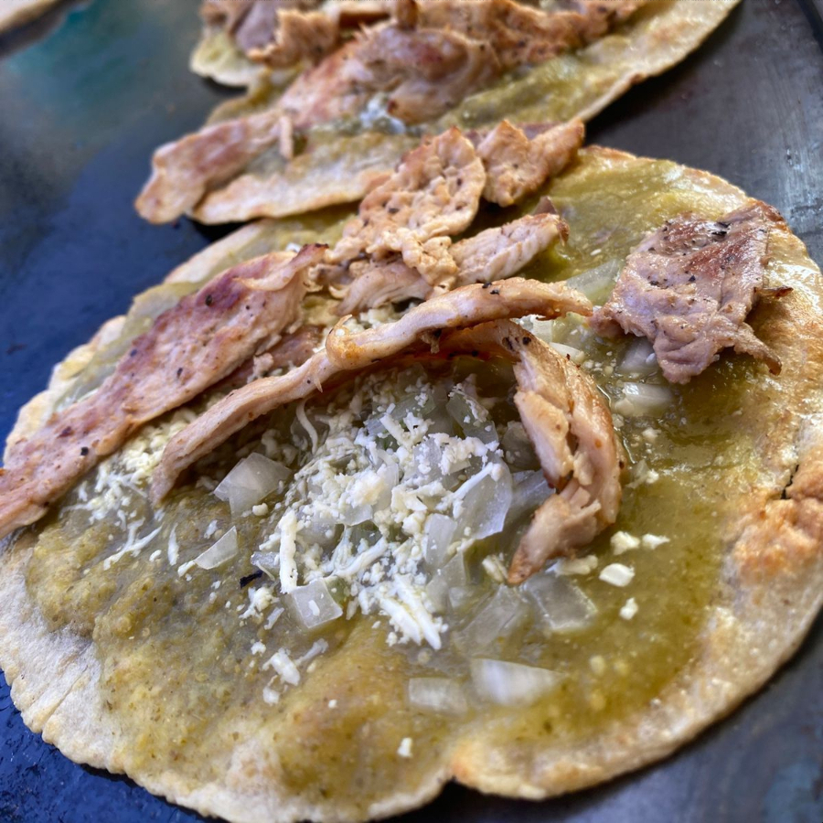 tortilla de maiz con quesillo, chicharron, rajas y epazote.