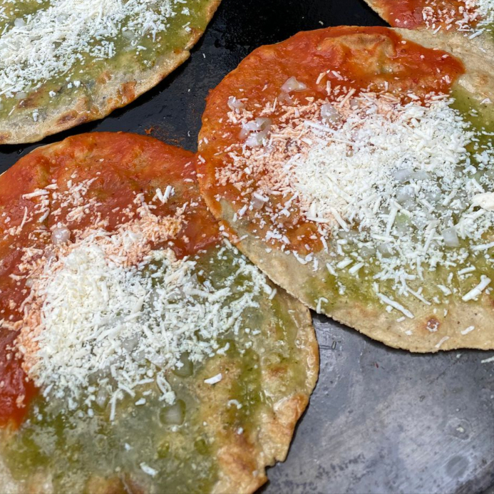 Gordita de maiz con salsa verde y roja, cebolla y quesillo.