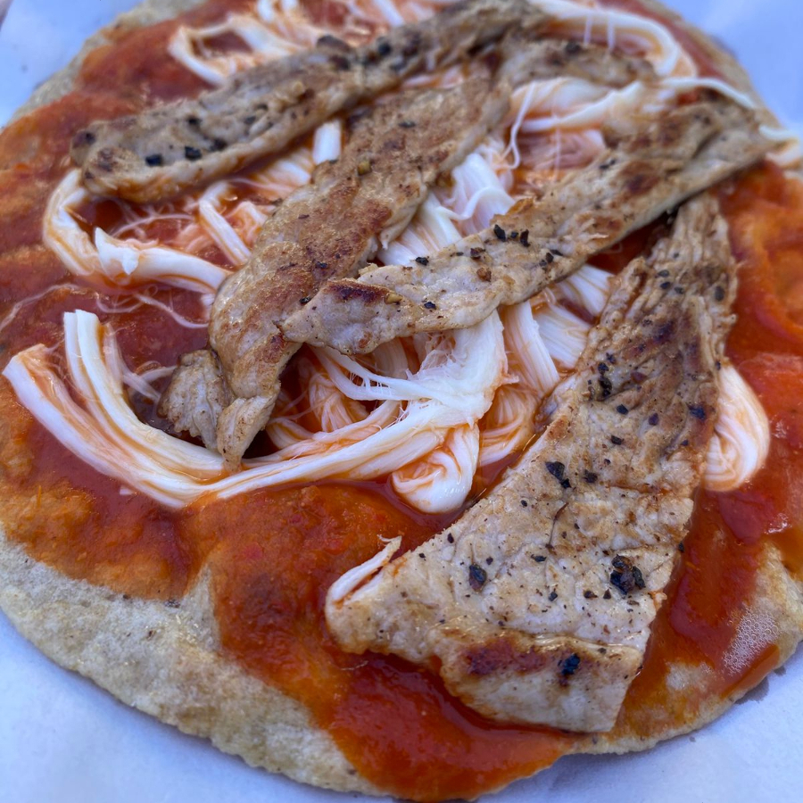 tortilla de maiz con quesillo, bistec, rajas y epazote.