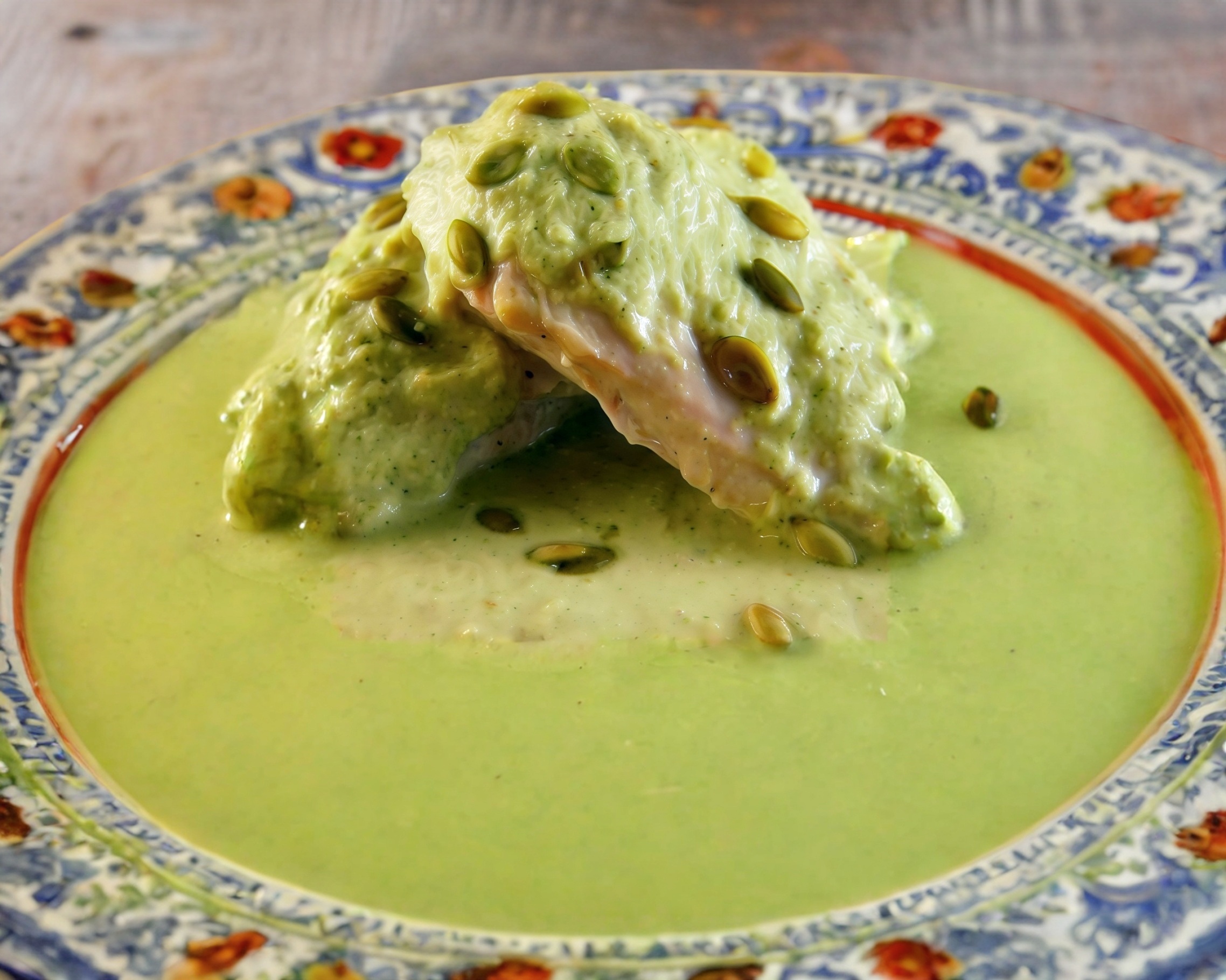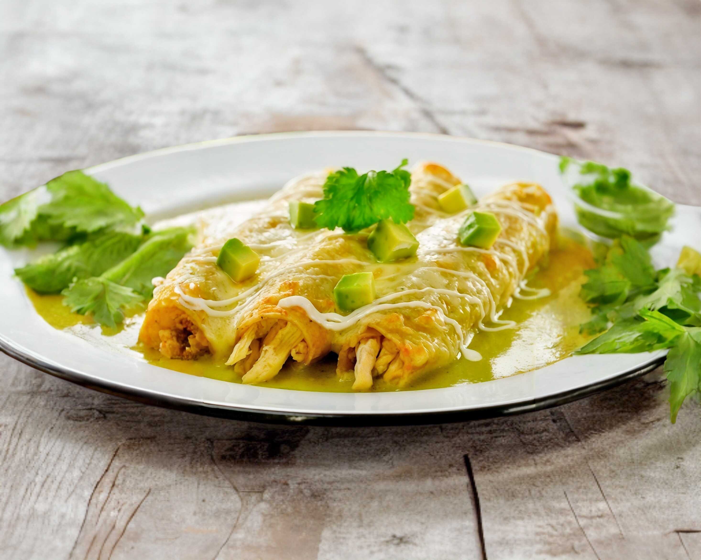 Tres tortillas fritas rellenas de pollo deshebrado, bañadas en salsa verde a la crema, gratinadas con queso manchego, decoradas con crema, aguacate y cebolla..