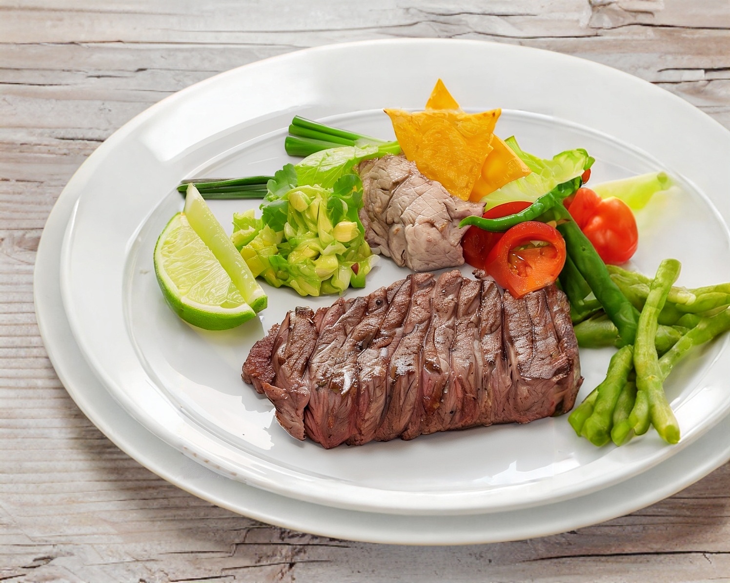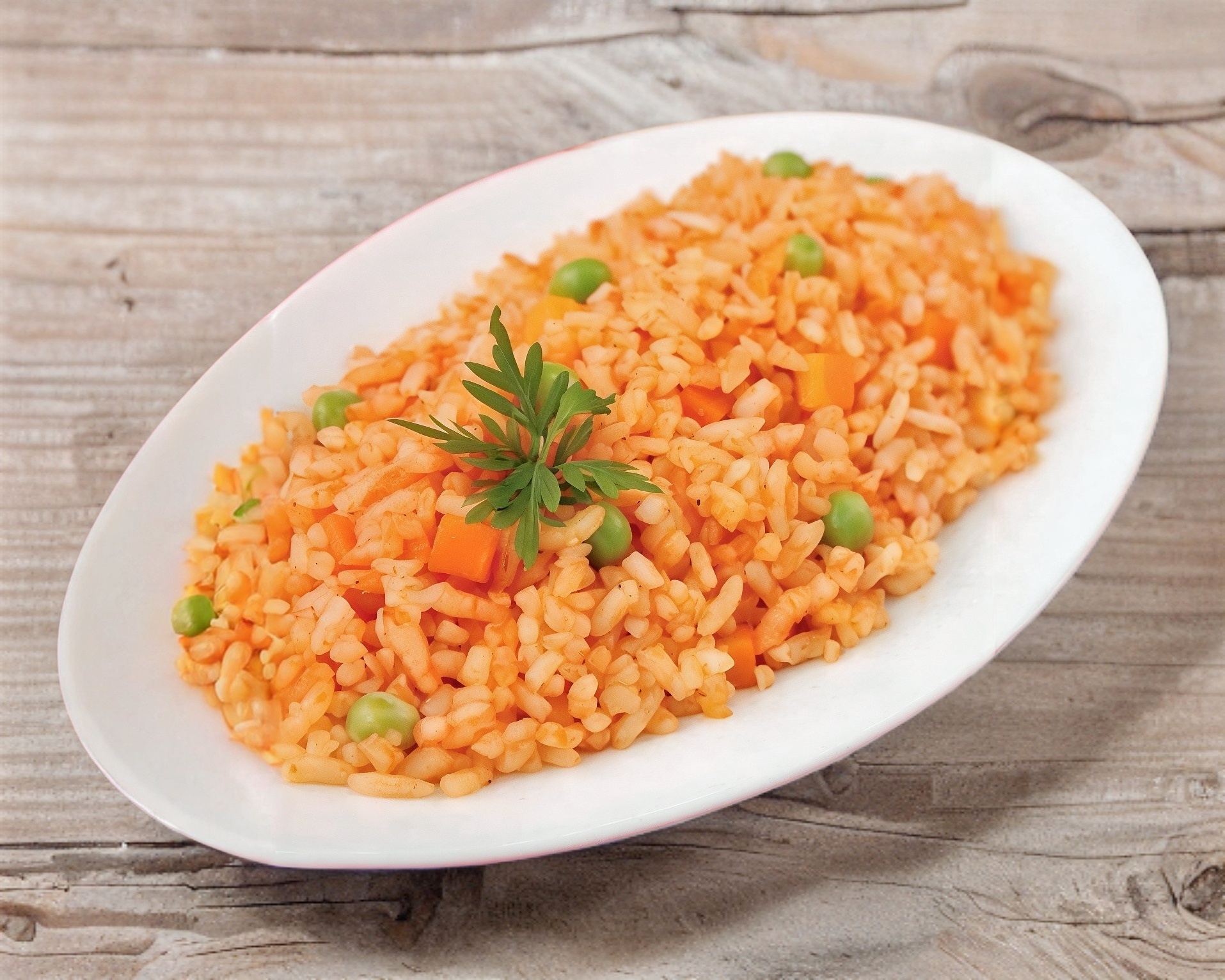 Acompañada de arroz, frijoles refritos, nopal asado y ensalada de lechuga.