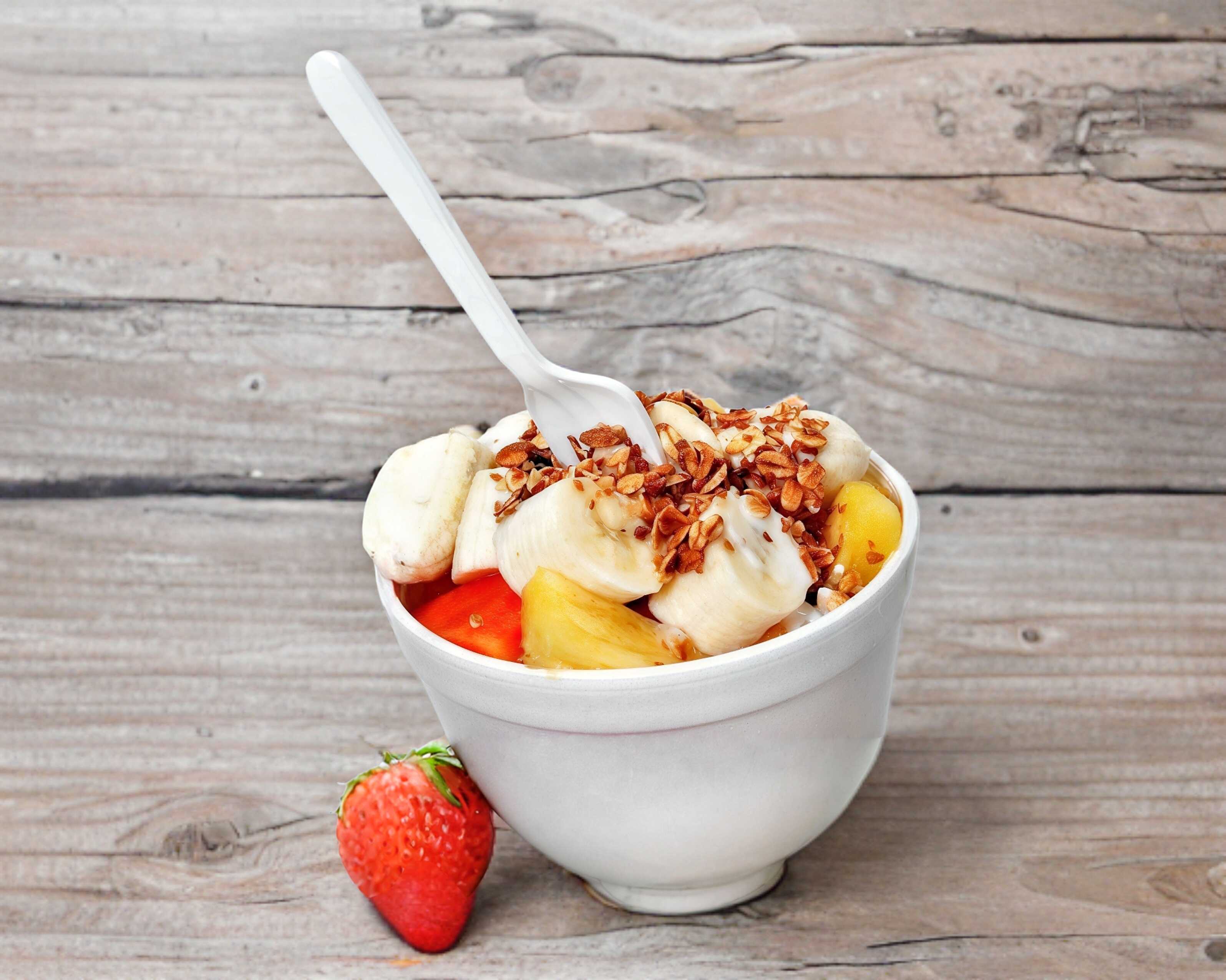 Cóctel con variedad de frutas de temporada topping a elegir y granola.