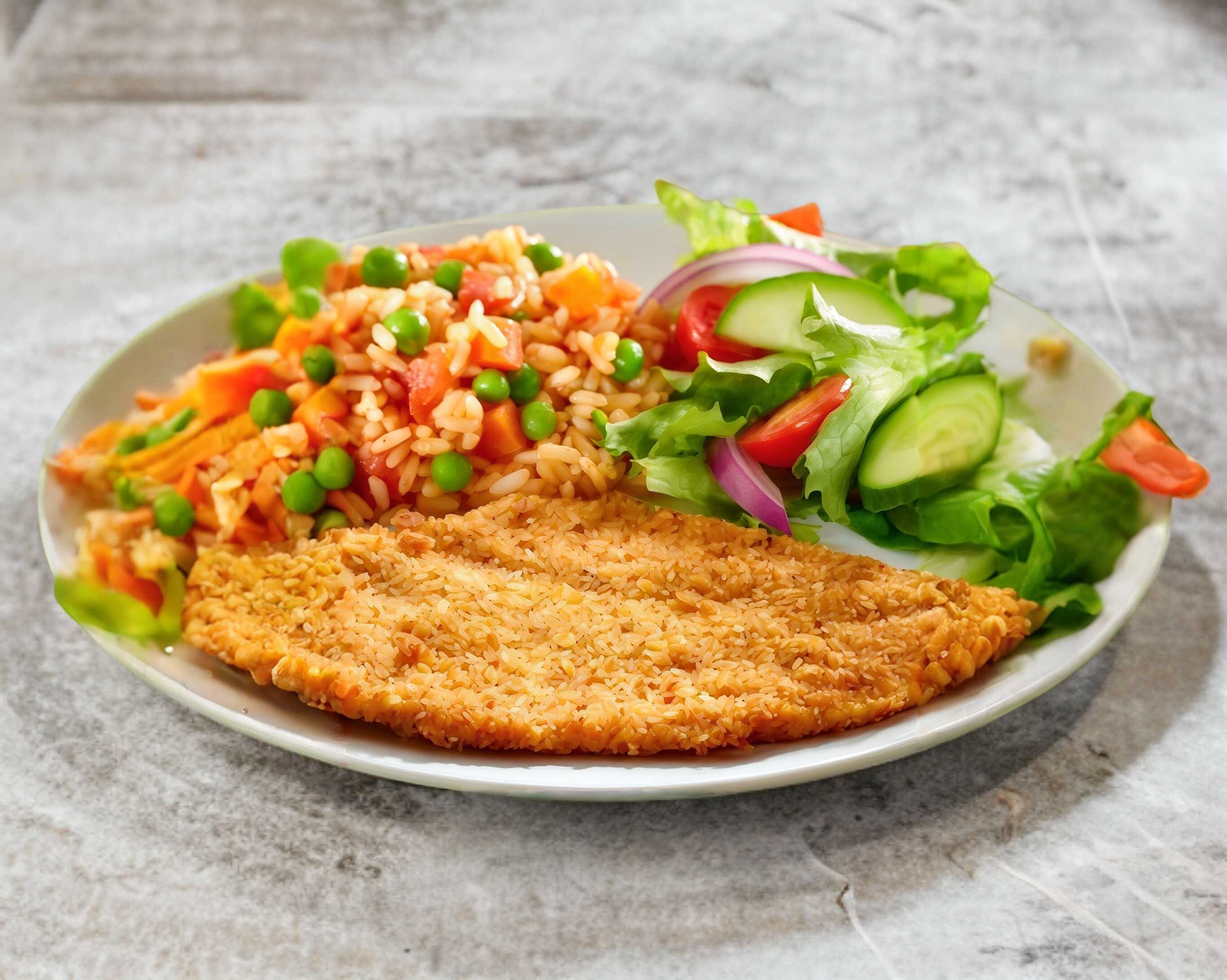 Milanesa con guarnicion de ensalada, arroz , frijoles refritos y 4 tortillas.