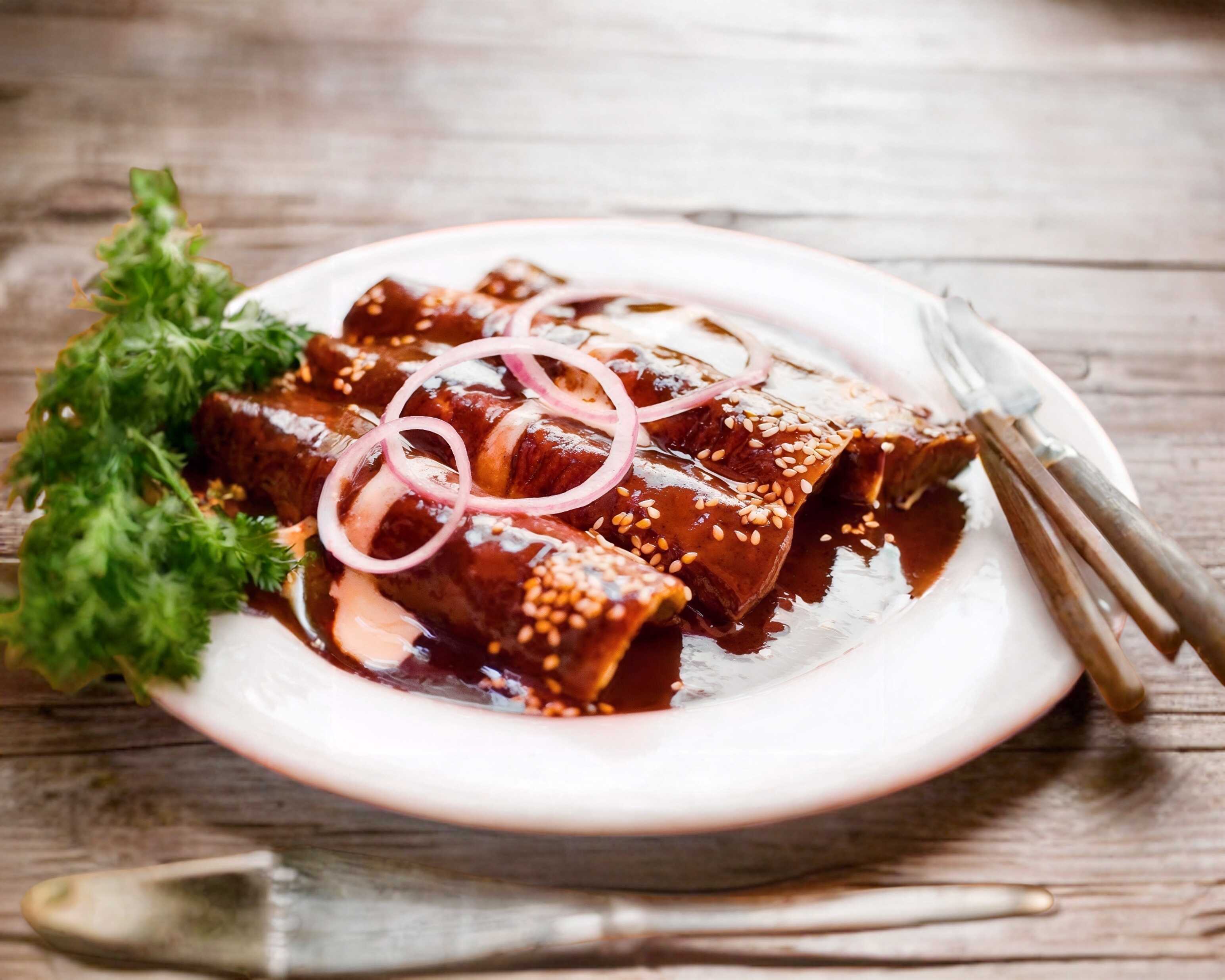 Tres tortillas fritas rellenas de pollo deshebrado, bañadas en mole poblano, decoradas con ajonjolin, cebolla, queso y crema.