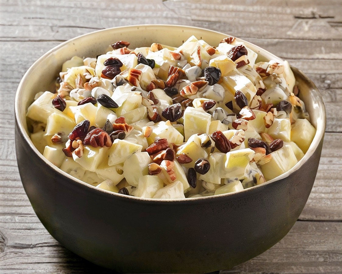Manzana en trozos mezclada con crema, leche condensada, nuez, arándanos, duraznos en almíbar.