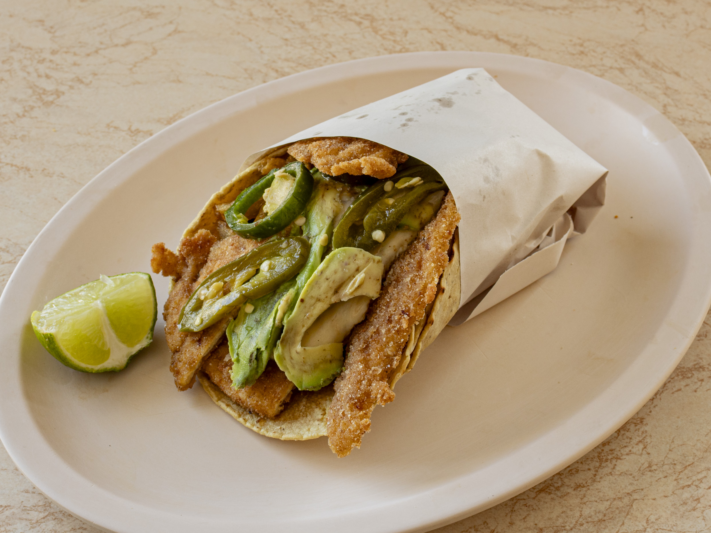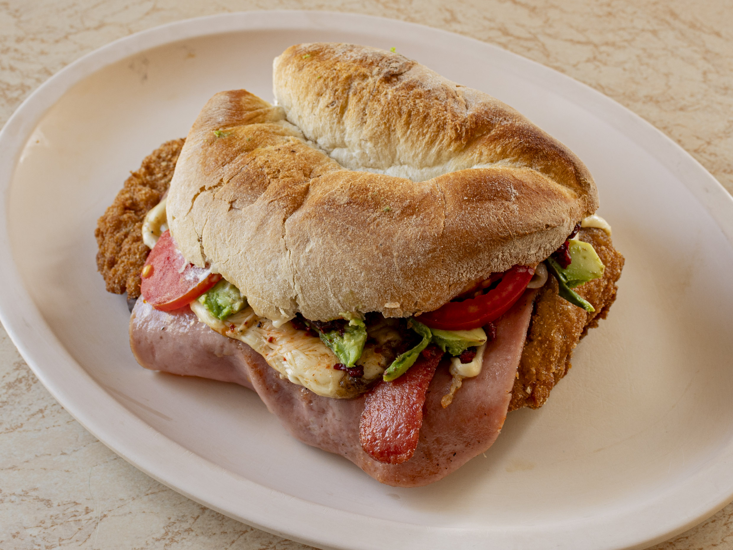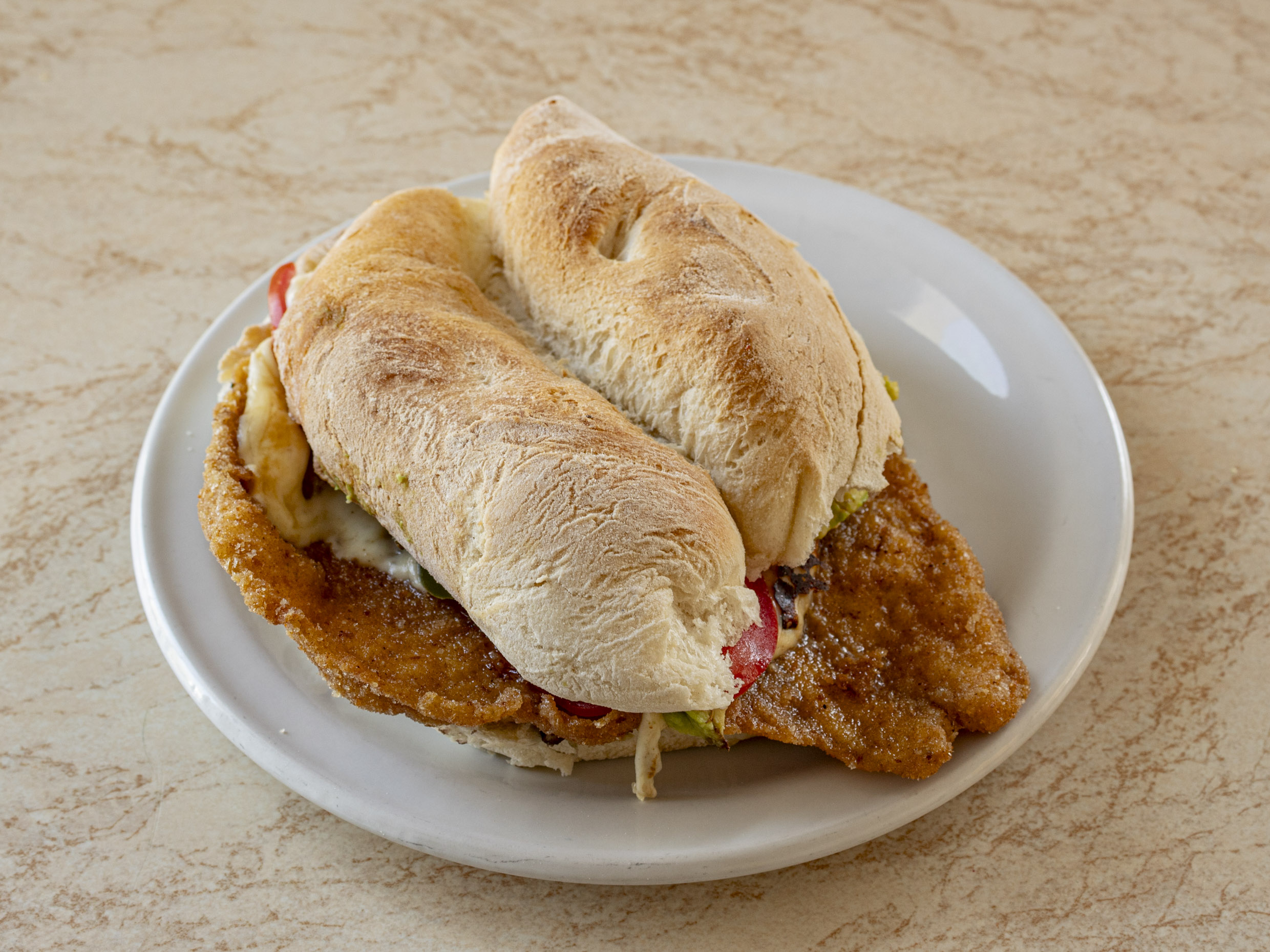 Torta de milanesa de pollo, con mayonesa, frijol, aguacate, cebolla, jitomate, queso fundido y jalapeño