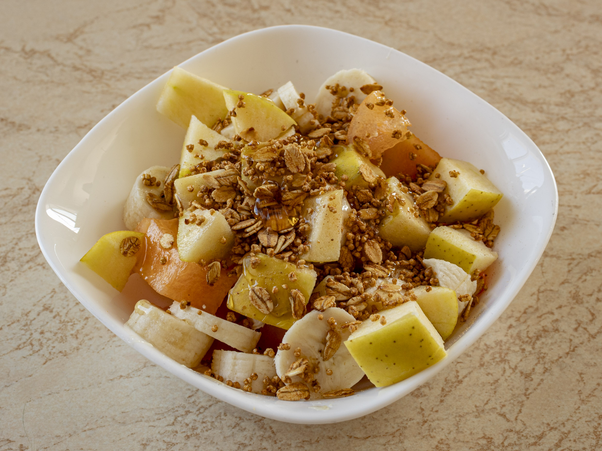 Melón, papaya, manzana, platano (con miel y granola)