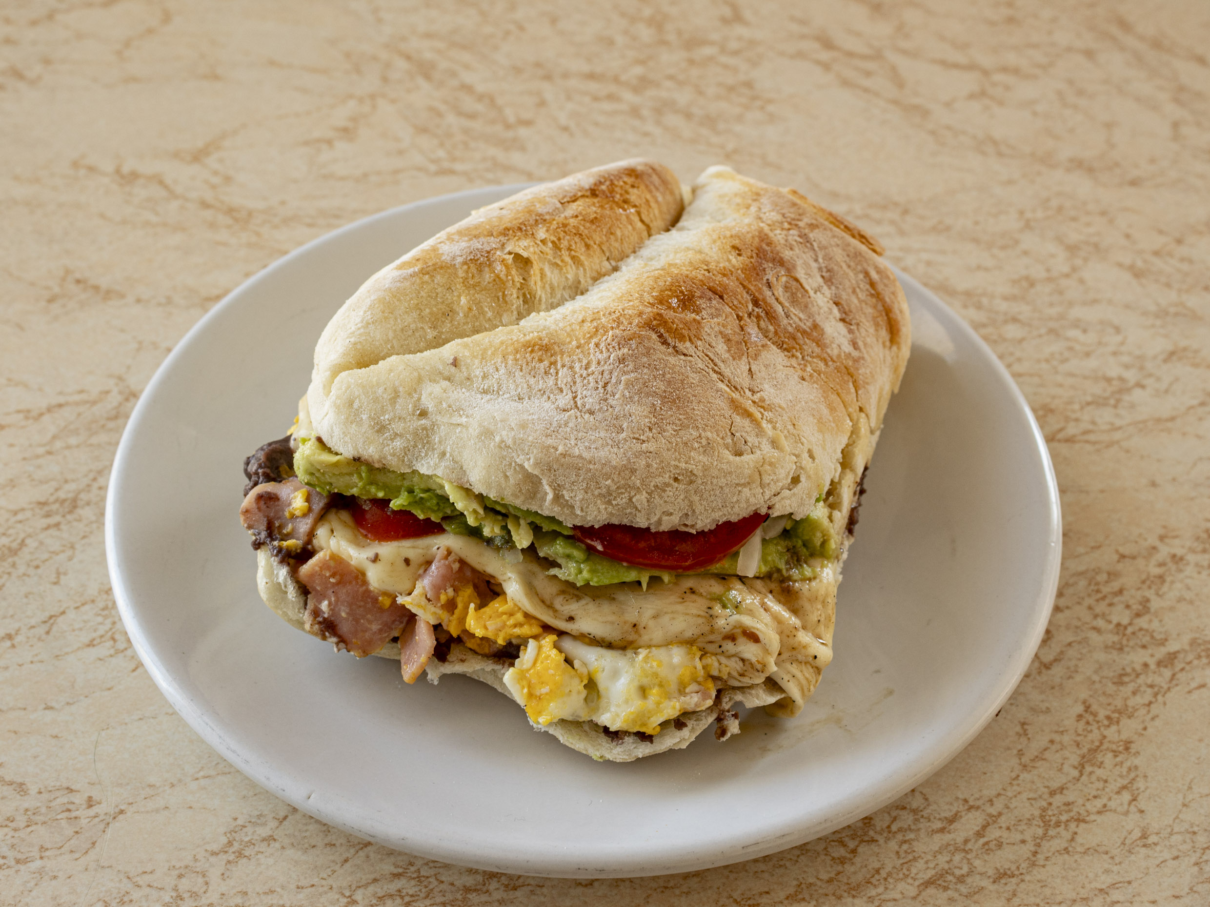 Torta de huevo con jamón, con mayonesa, frijol, aguacate, cebolla, jitomate, queso fundido y jalapeño