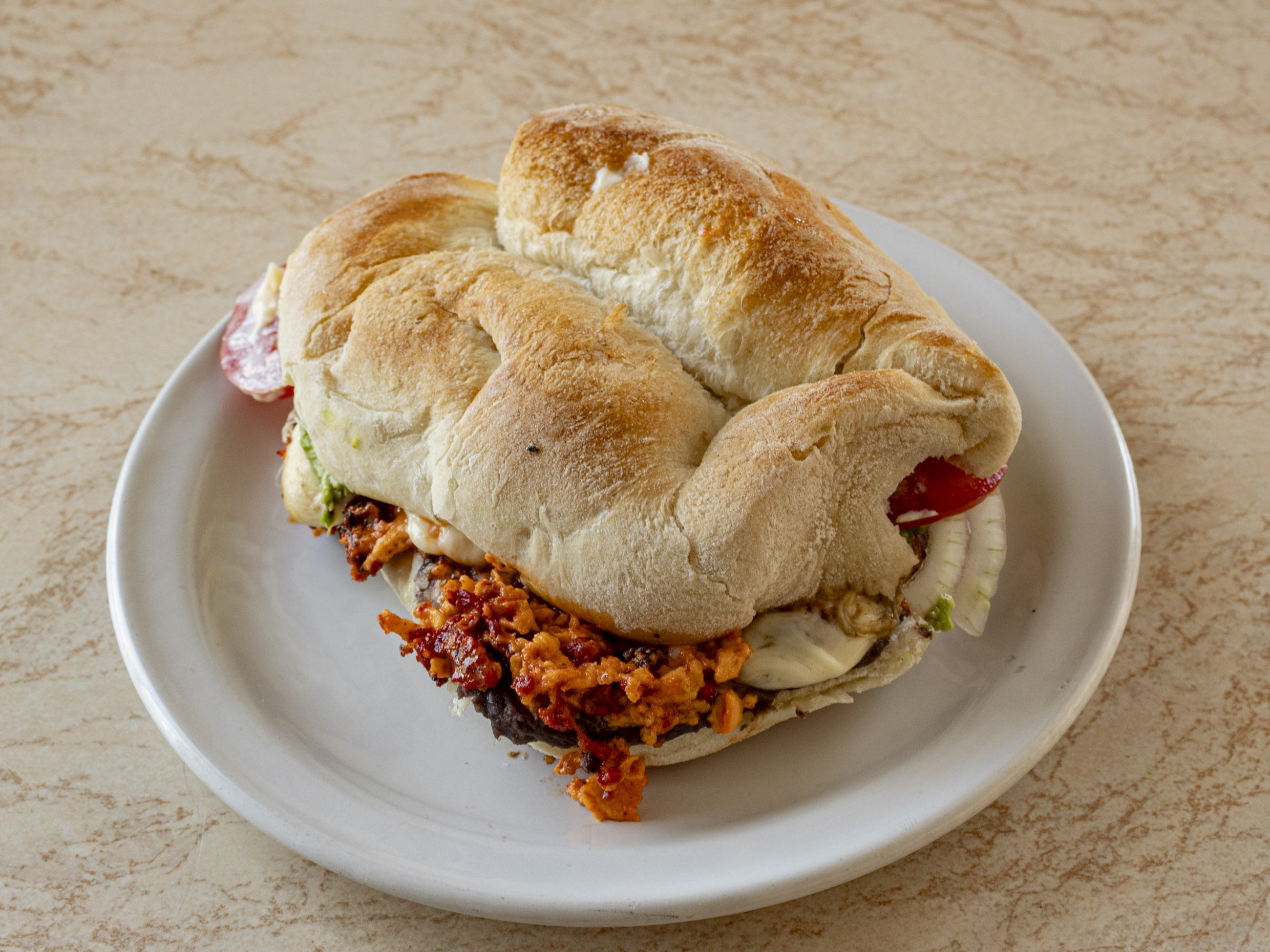 Torta de huevos con chorizo, con mayonesa, frijol, aguacate, cebolla, jitomate, queso fundido y jalapeño