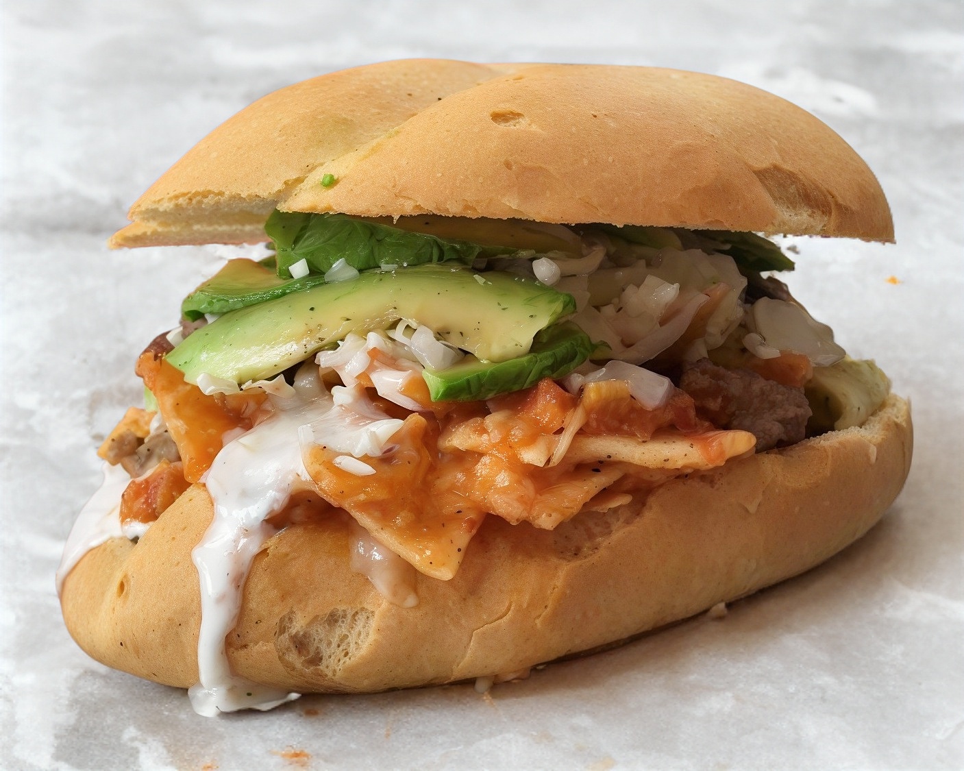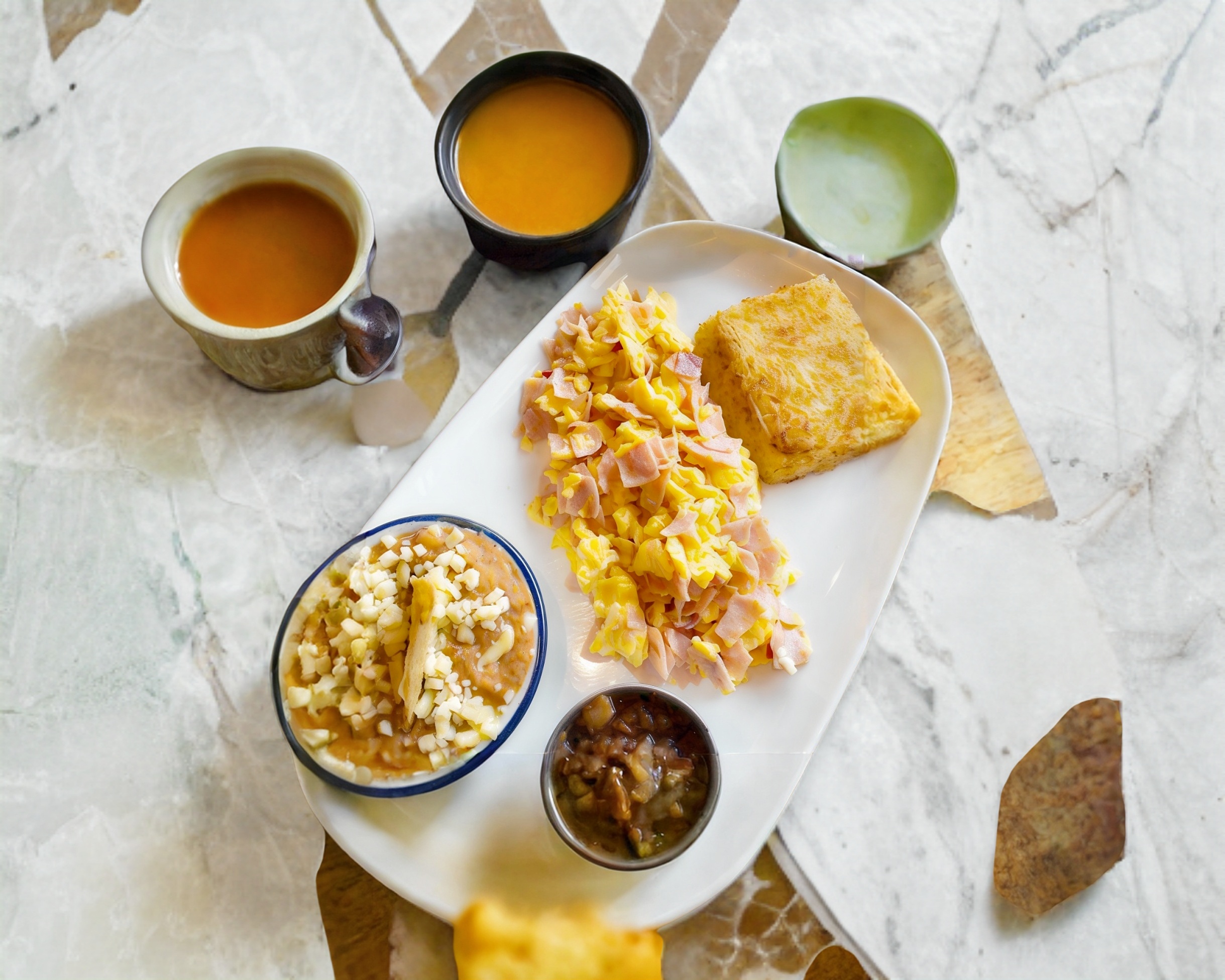 3 Tortillas fritas rellenas de pollo o huevos, acompañadas de longaniza, queso, crema, cebolla y pan salado.