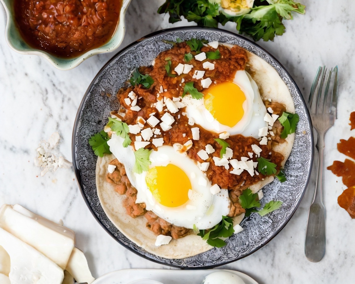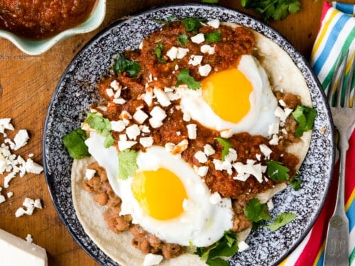 2piezas de huevo estrellado sobre tortilla frita con una cama de frijoles bañados de salsa roja queso y crema