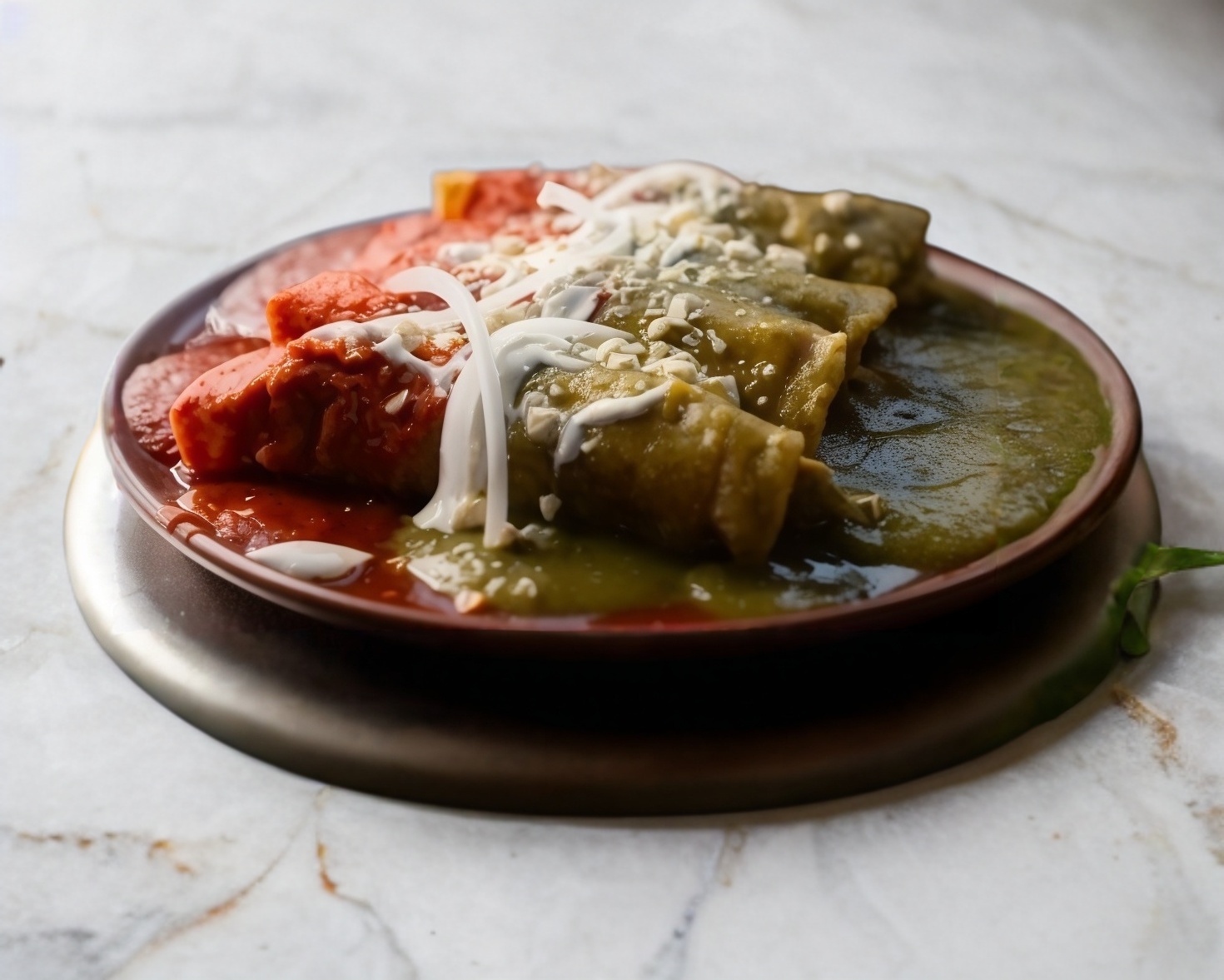 3 Tortillas fritas rellenas de pollo o huevos gratinadas con queso Manchego, acompañadas con crema, cebolla, pan salado y frijoles.