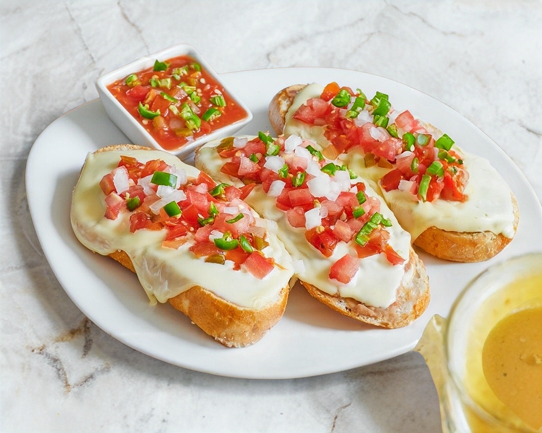 4 Piezas de pan artesanal con base de frijol, gratinado con queso y proteina de elección acompañado de pico de gallo