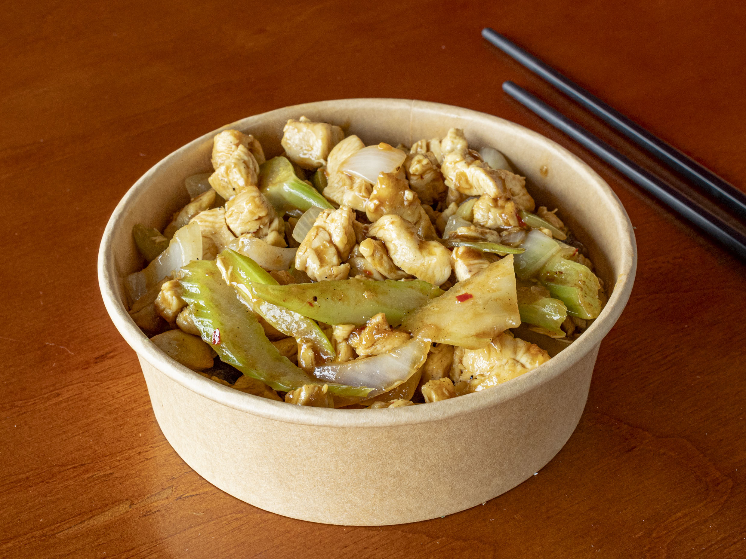 Trozos de pollo marinado, salteados con salsa de ostión, apio, jícama y cebolla. Mejor pídelo en paquete, 16 Oz vol, predominan las verduras.