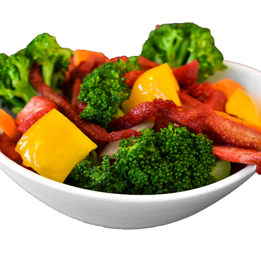 Trozos de bisteck (50 g) salteados con en nuestra salsa de champiñones con brócoli, zanahorio, cebolla y apio. Mejor pídelo en paquete, 16 Oz vol, predominan las verduras.