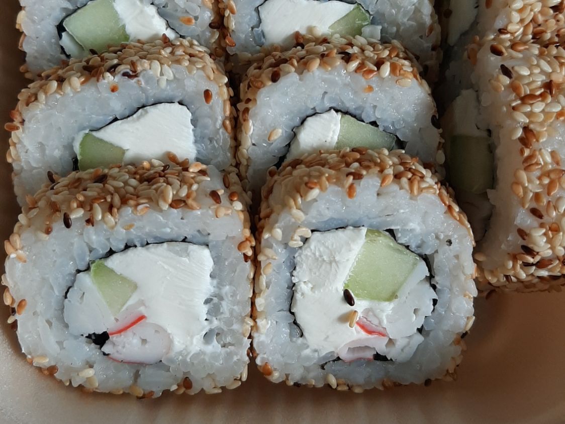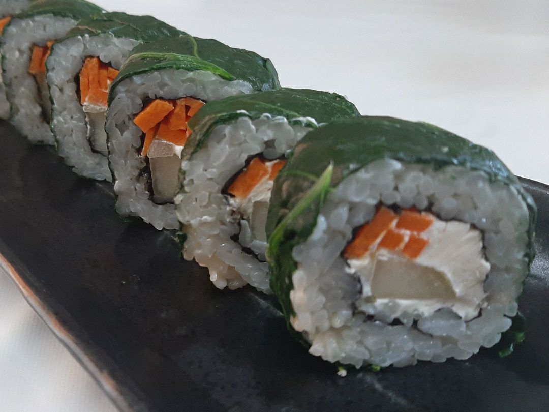 Relleno de queso crema, pepino, zanahoria. Por fuera espinaca o alga completa