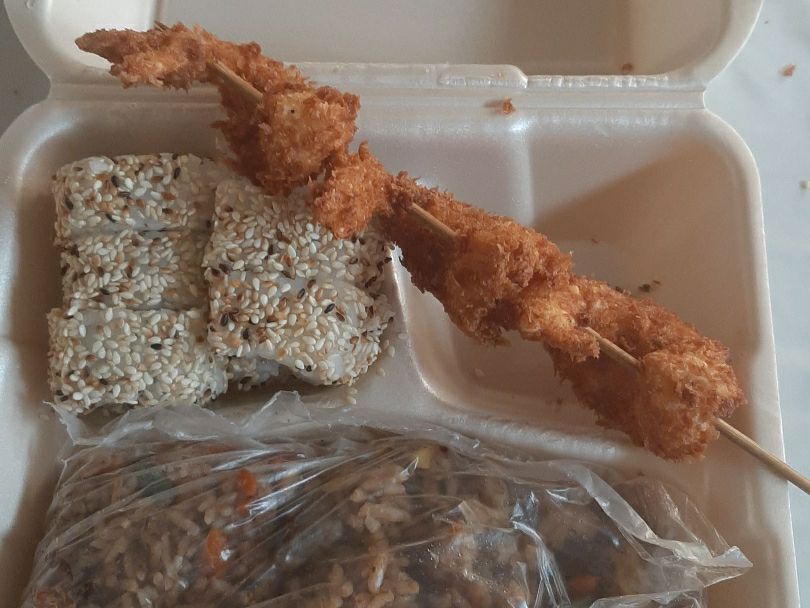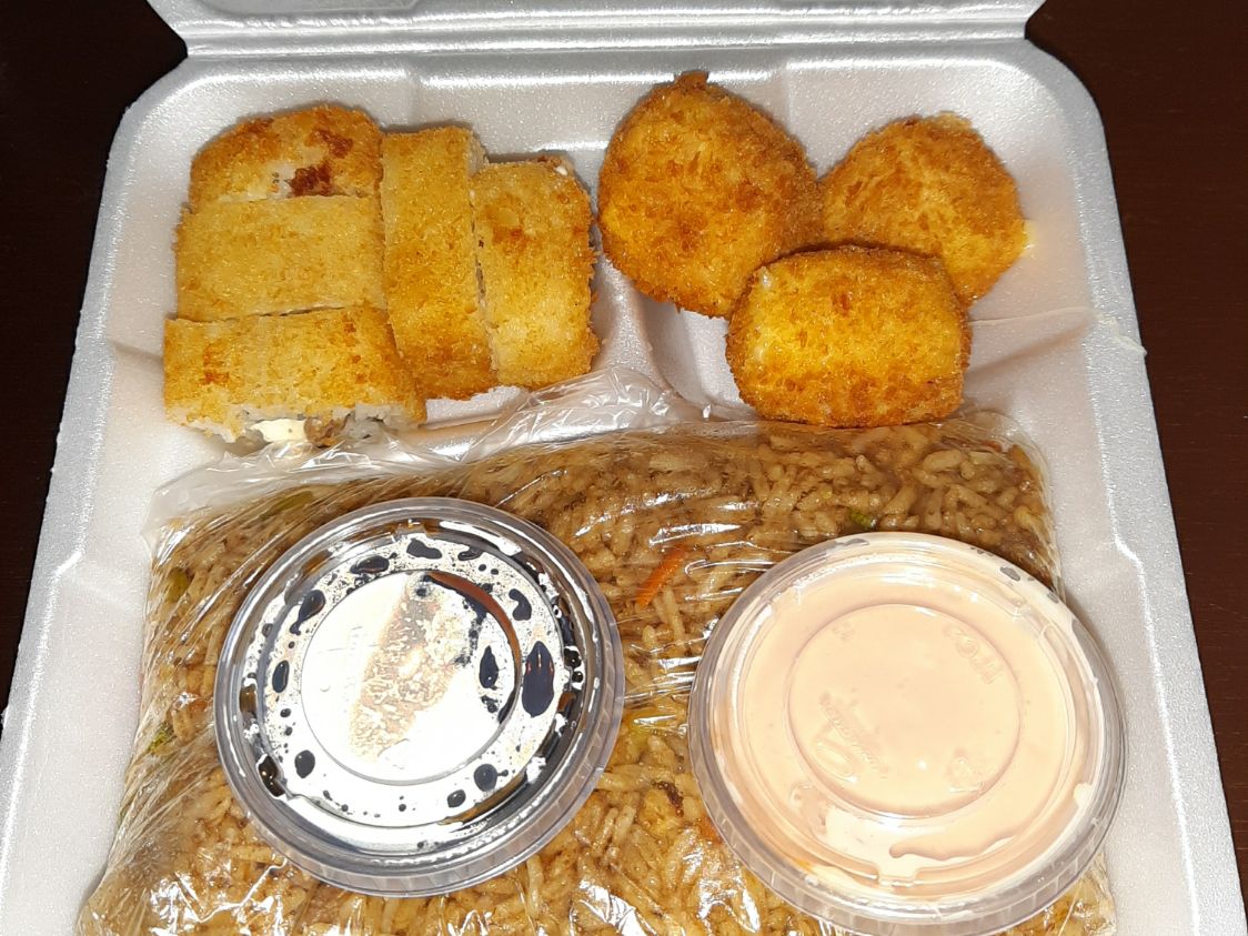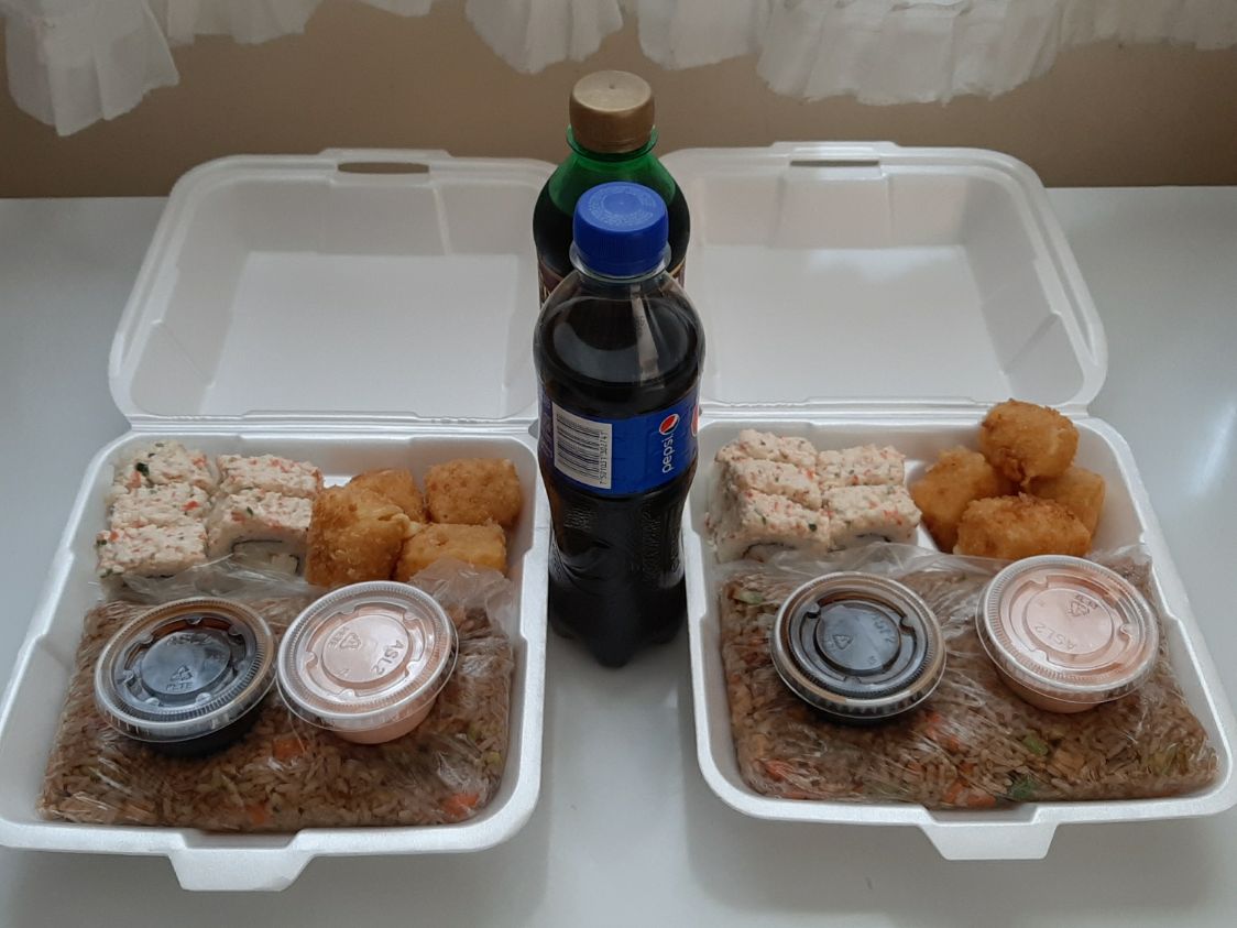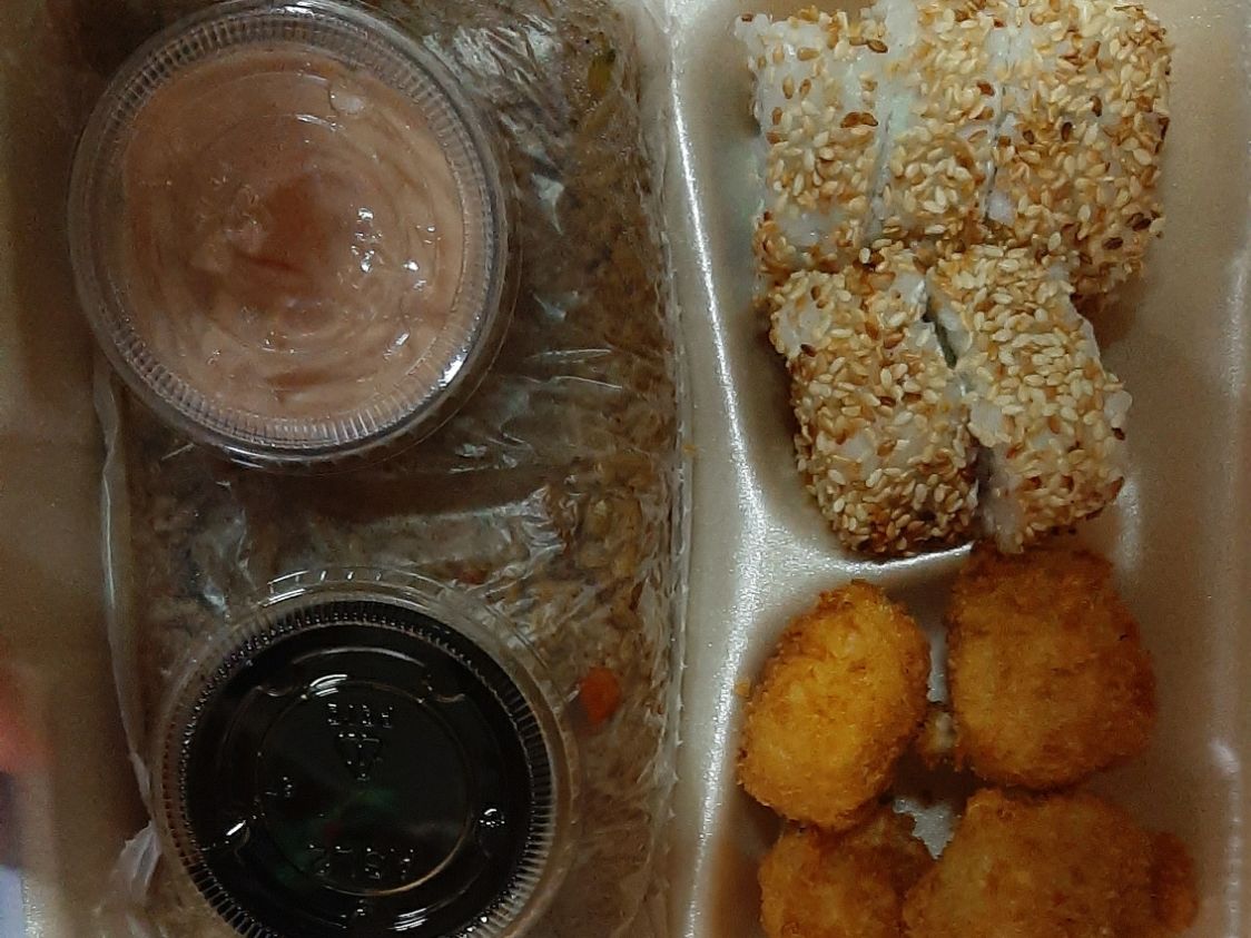 5 PZA DE CALIFORNIA MAKI,4 PZA DE KUSHAGE DE PLATANO. 200G DE YAKIMESHI Y UN RESFRECO.