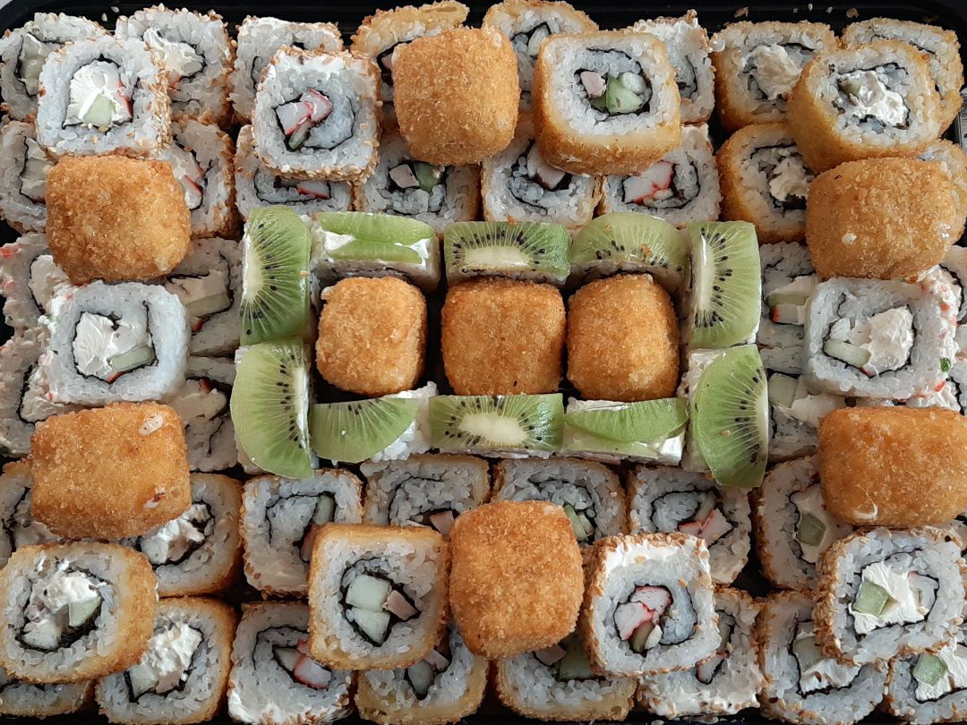 Relleno de queso crema, salmo, massago, camaron, pulpo, surimi.