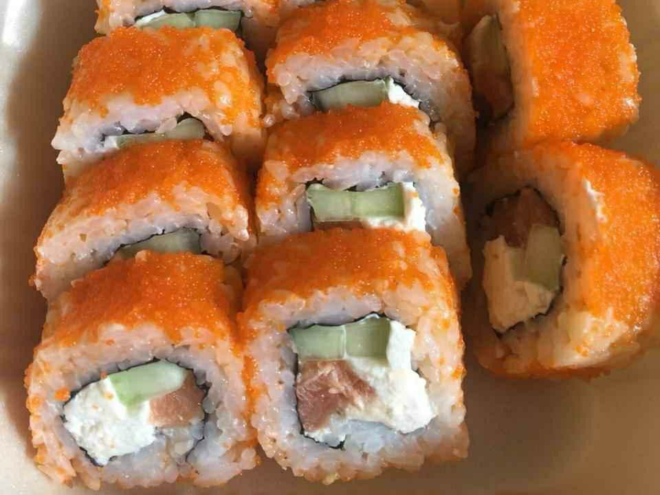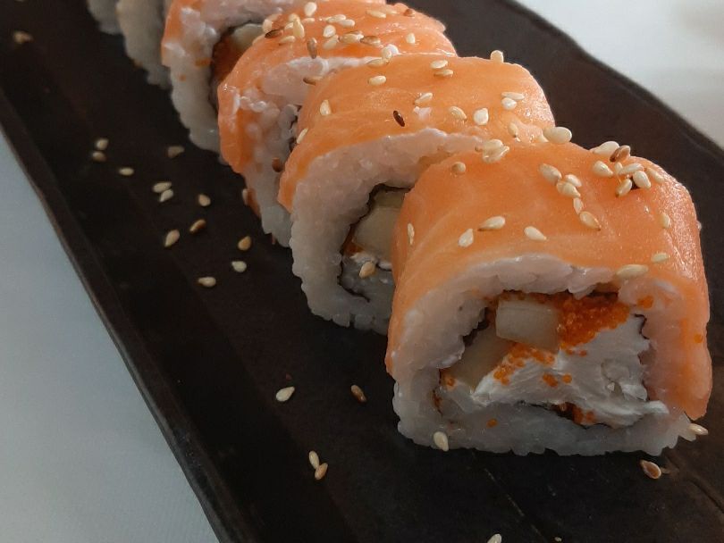 Relleno de queso crema, pepino y salmón fresco. Por fuera massago y ajonjolí