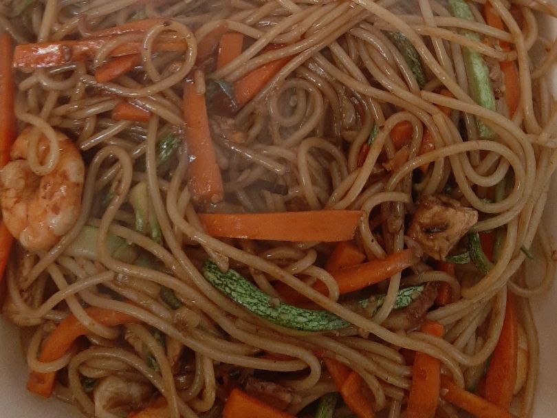 40 minuto Tallarines fritos a la plancha con zanahoria, calabaza, champiñón, polo y camarón en salsa agridulce.