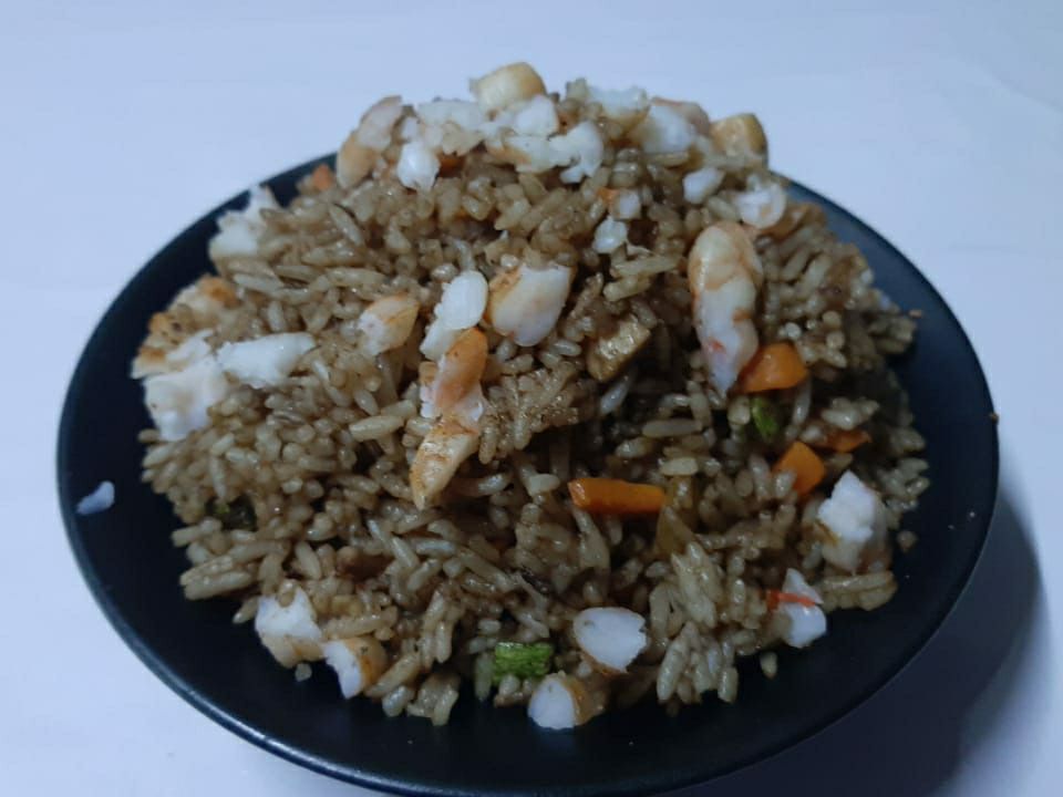 400 Gramos de arroz frito a la plancha con verdura mixta, pollo,res y mariscos.