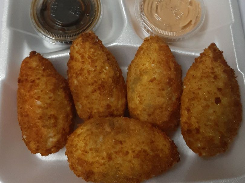Relleno de queso crema y surimi. Por fuera empanizado de coco