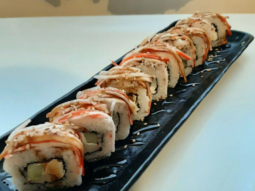 Relleno de queso crema, pepino, surimi y camaró Por fuera surimi fileteado, salsa de anguila y ajonjolí