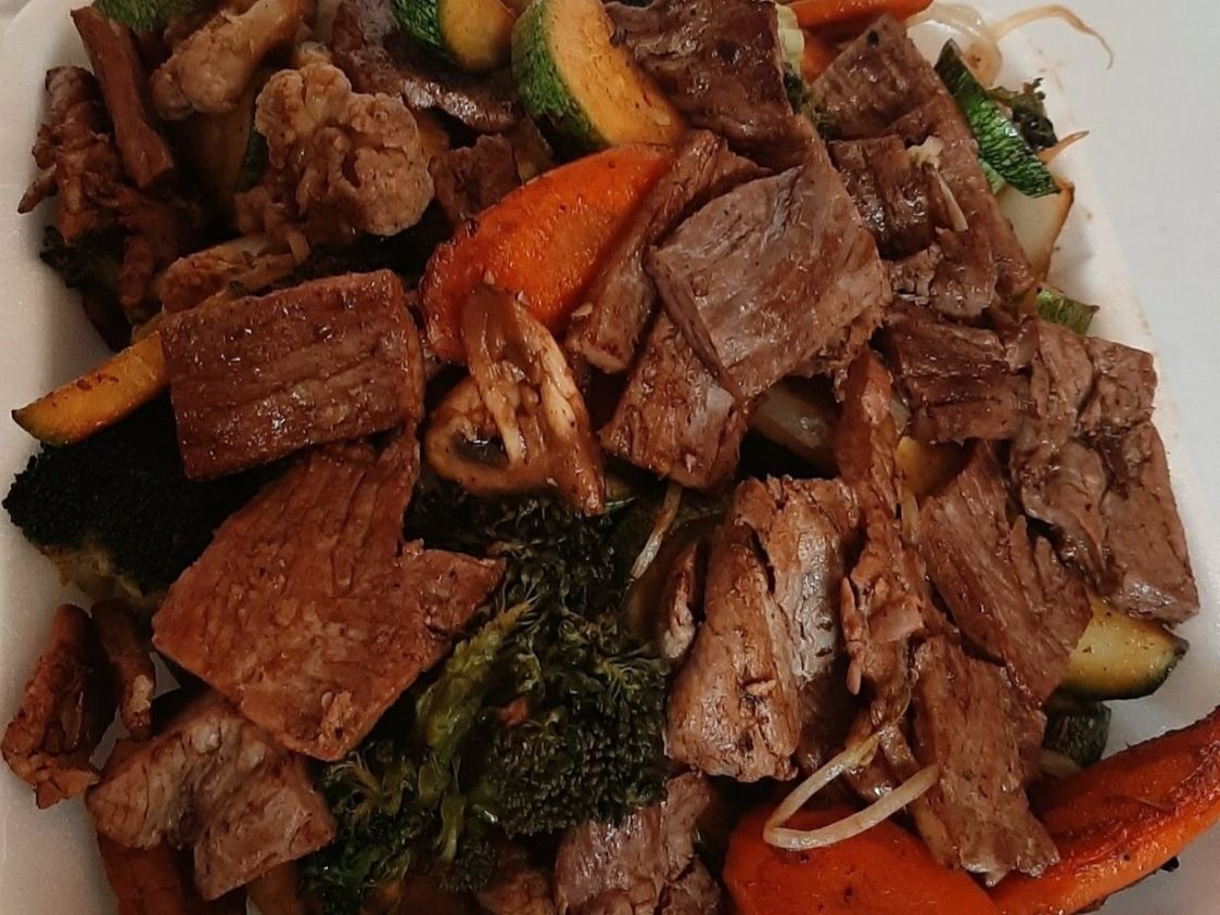 Tallarines fritos a al plancha con zanahoria, calabaza, champiñón con arrachera.