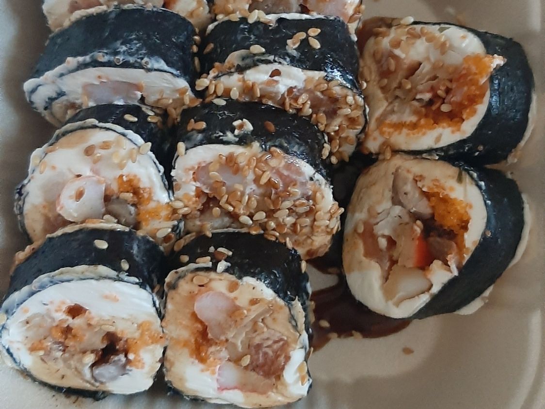 Arroz, relleno de queso crema, camarón, salmón,surimi, massago. Por fuera arroz y empanizado n salsa de angila.