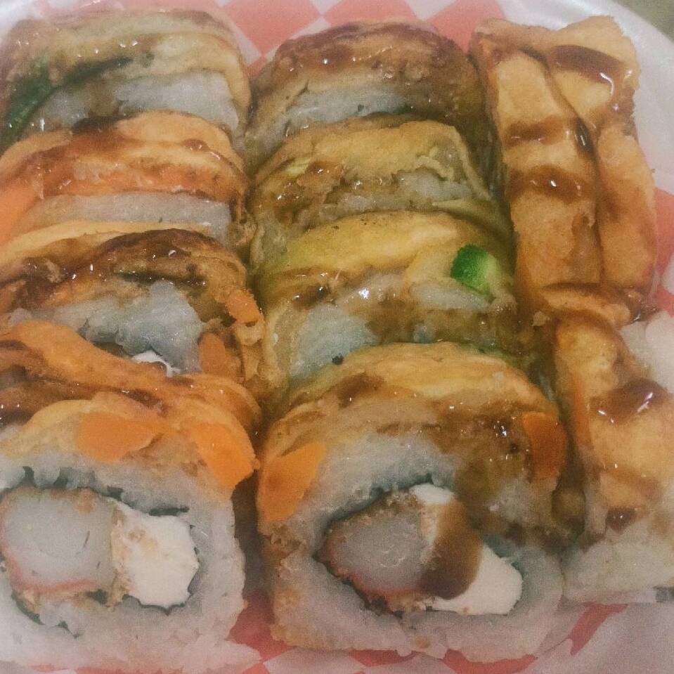 Relleno de queso crema, pepino y camaron empanizado o capeado en tempura. Por fuera aderezo de tampico de abanero