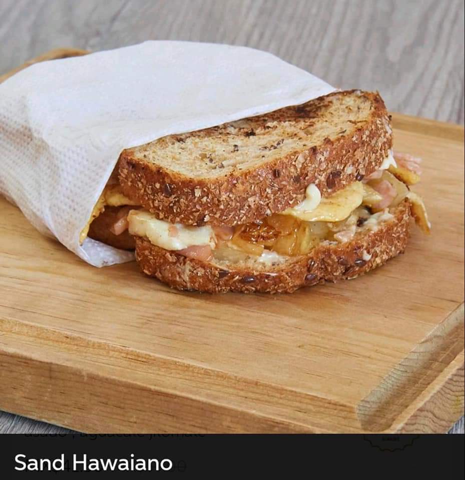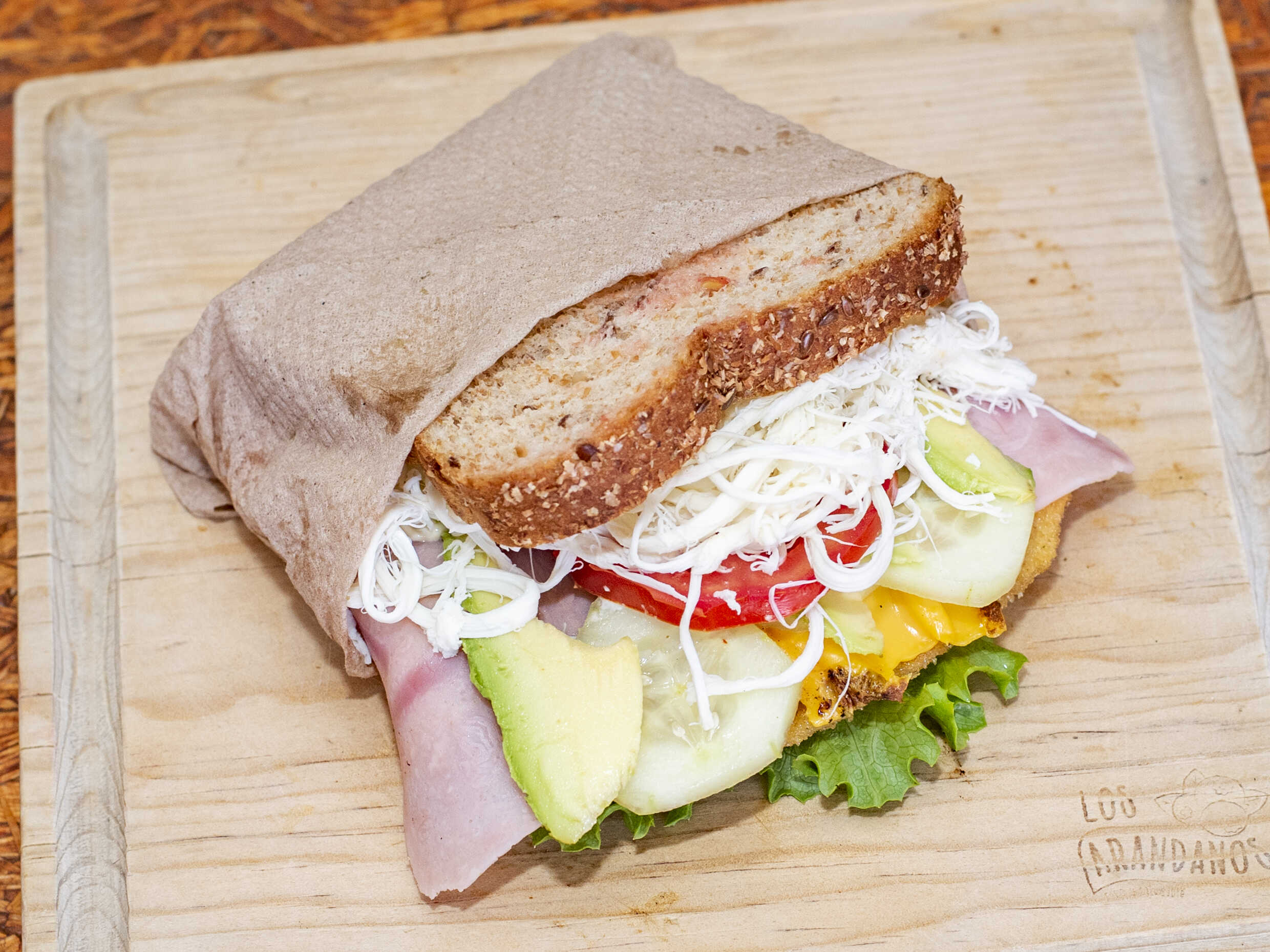 Mayonesa, piña, pollo asado, jamón, queso manchego y pan de linaza.