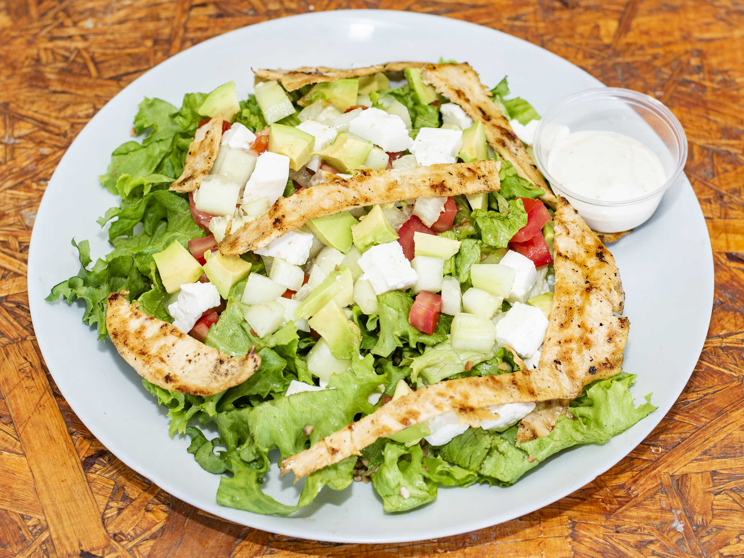 Lechuga fresca, jitomate, queso panela, pepino, aguacate, pollo asado y aderezo césar.