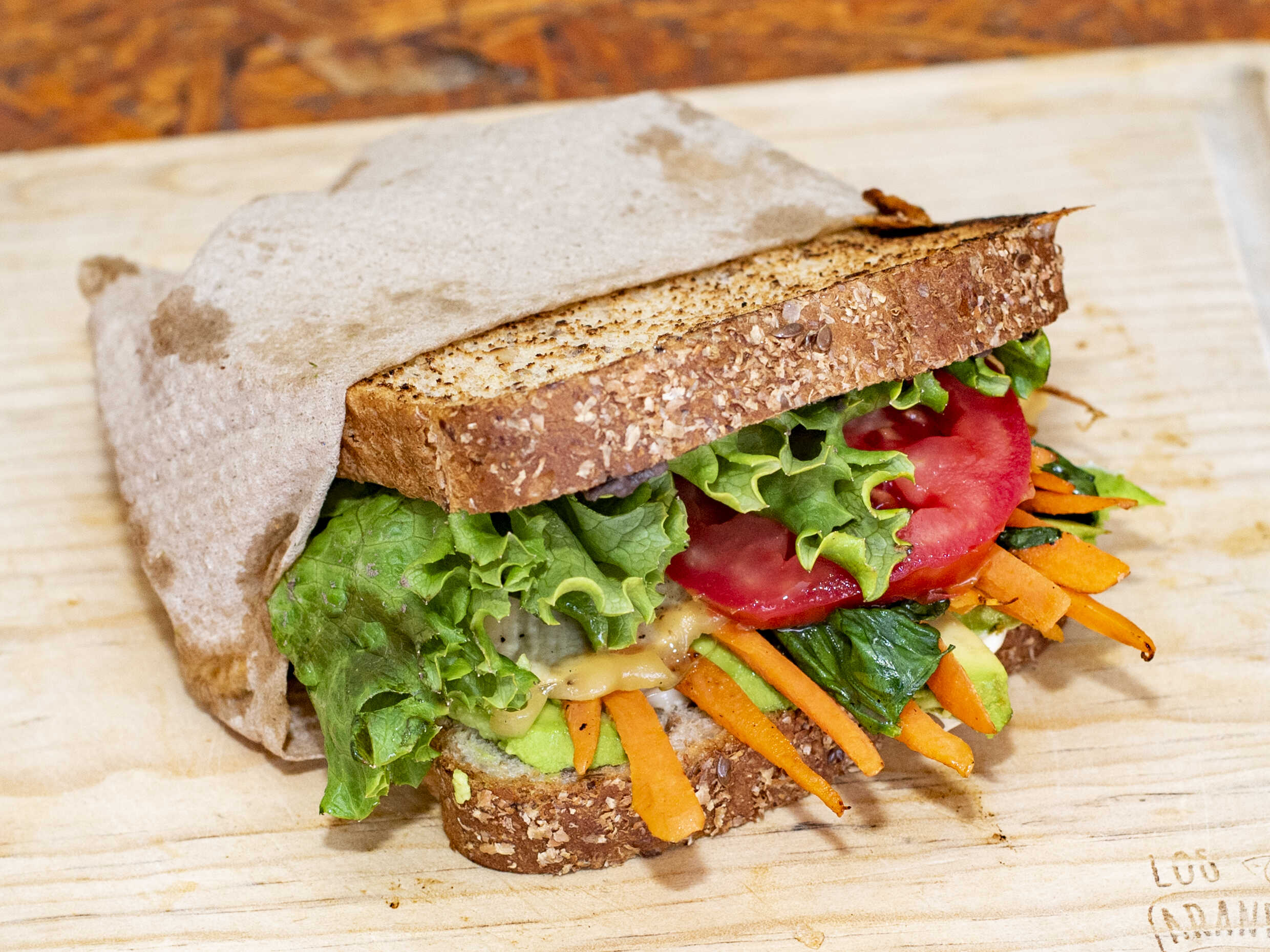 Pollo asado, espinaca, zanahoria salteada, queso manchego, aguacate, jitomate y pan de linaza.