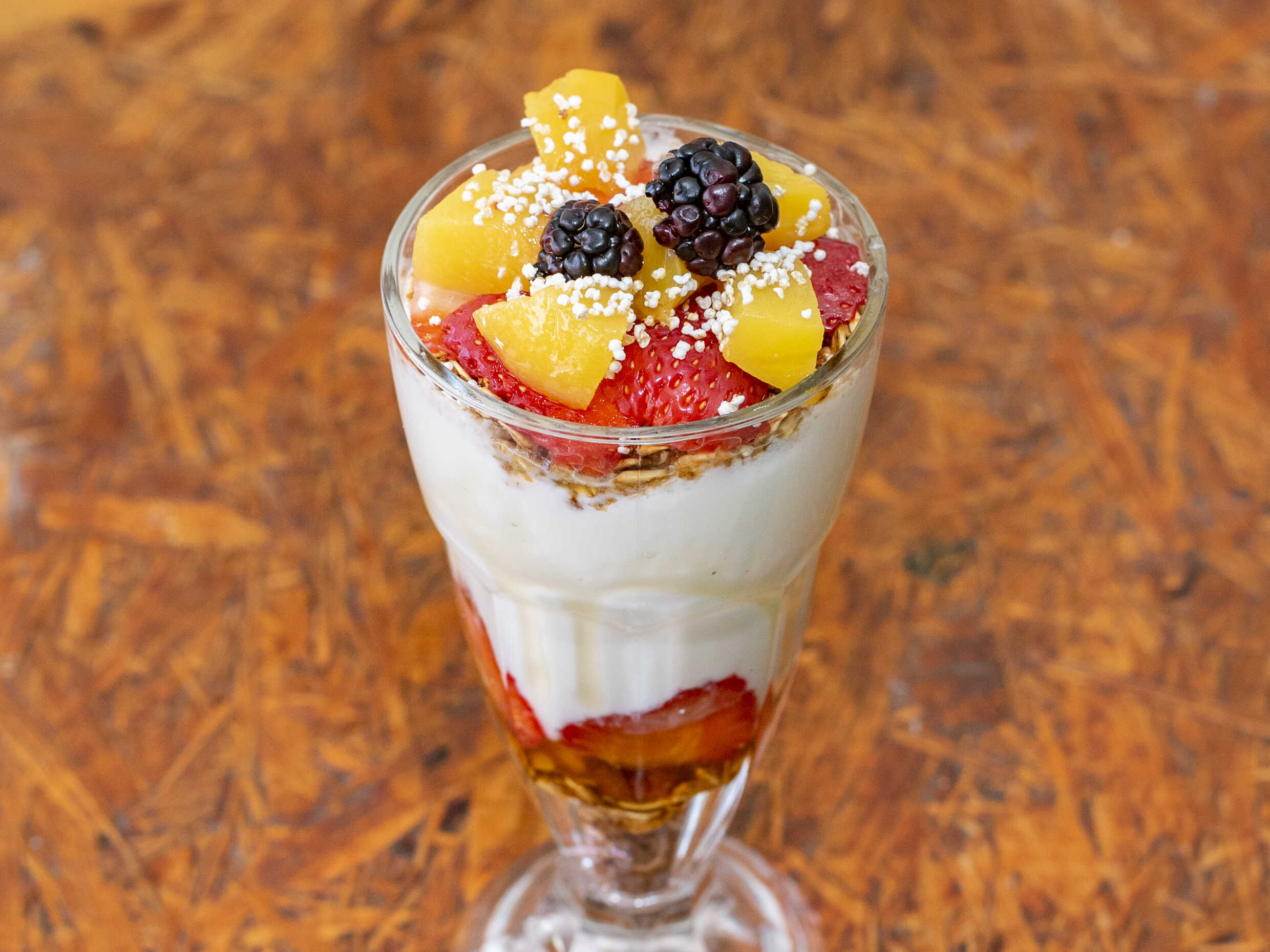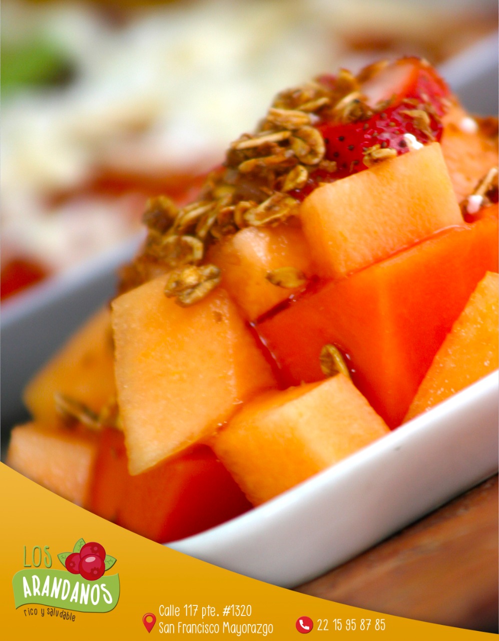 Fruta fresca del día, papaya, melón, plátano, manzana y fresa acompañado de granola, miel y yoghurt.