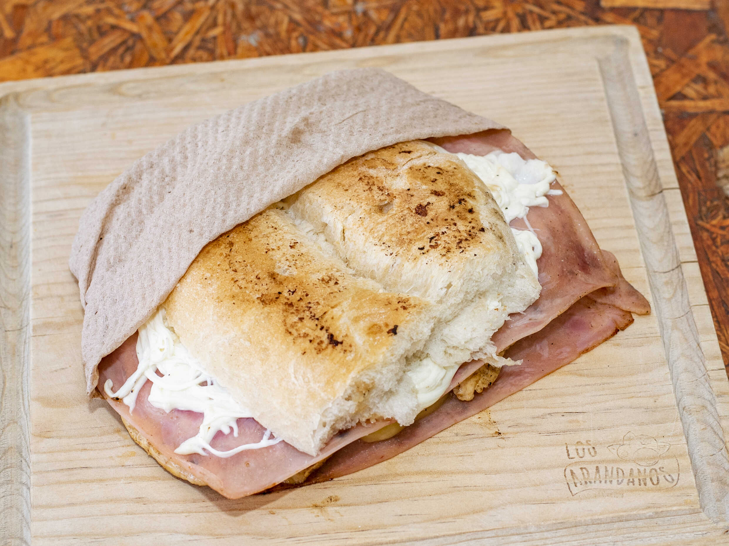Mayonesa, piña, pollo, jamón y queso manchego.