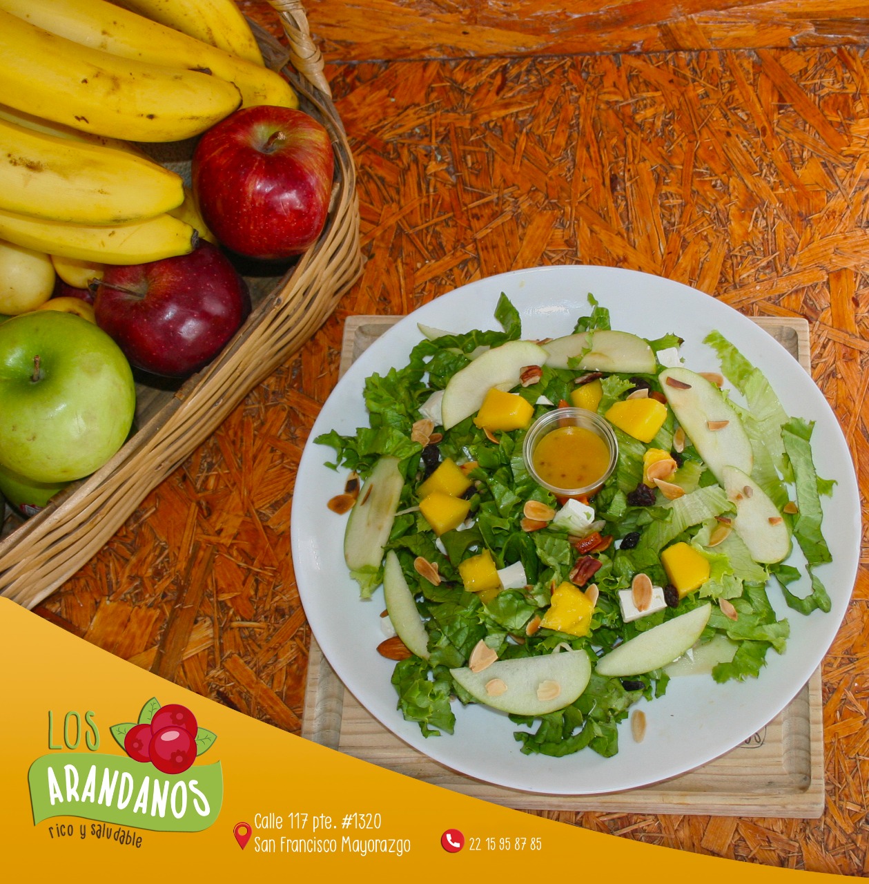 Lechuga fresca, queso panela, frutos secos, manzana verde, mango y almendra tostada.