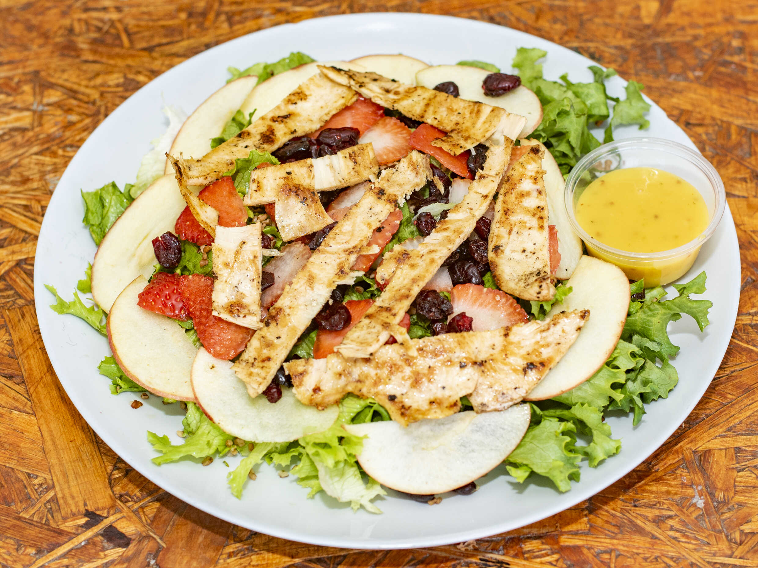 Lechuga fresca, manzana roja, fresa, nuez, arándano y pollo asado con aderezo de mostaza-miel.