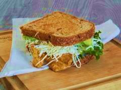 1 Sándwich de milanesa de pollo + Coctel de fruta individual (Fruta a disponibilidad) + Jugo de naranja natural (12 Oz)